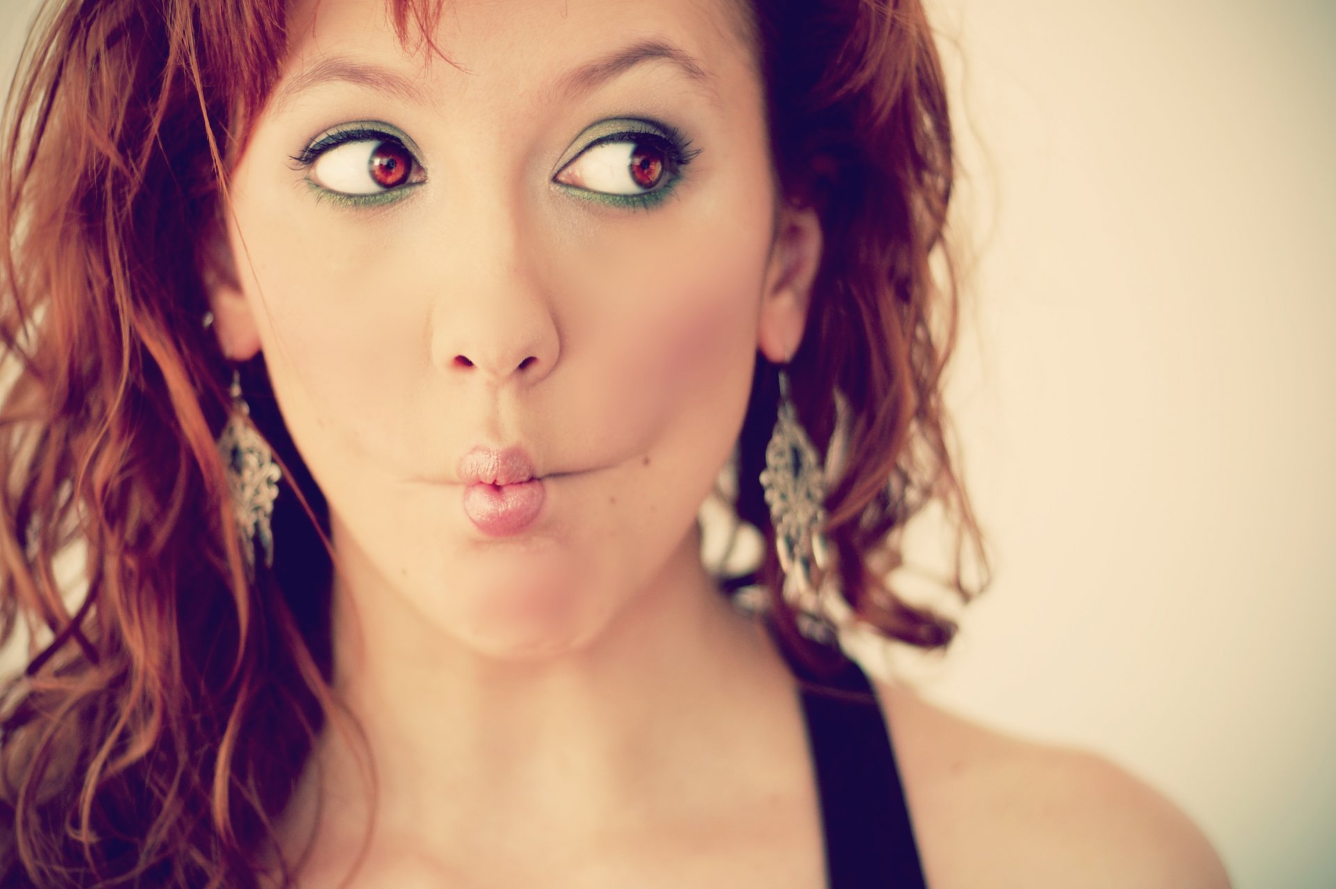 Ruda dziewczyna z figlarnym spojrzeniem, gąbki kokardką