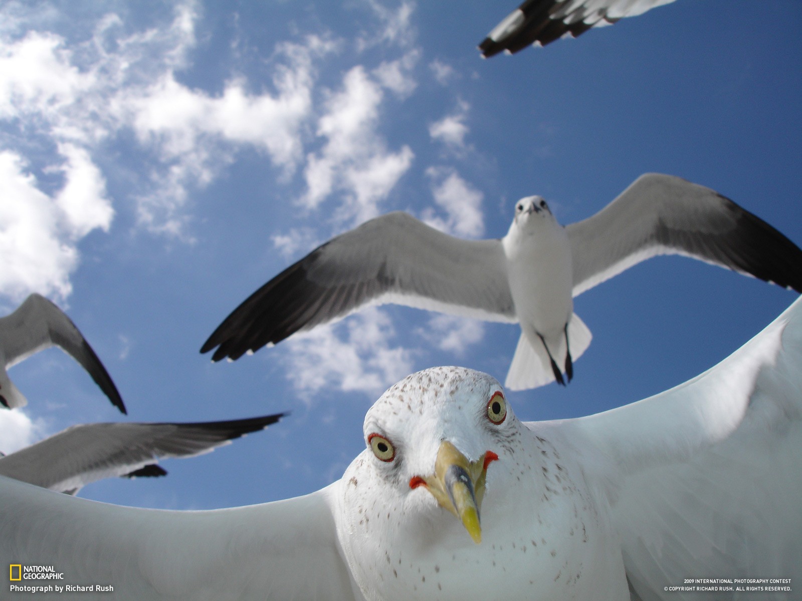 Mewy na tle zachodu Słońca i szwajcarskiego jeziora