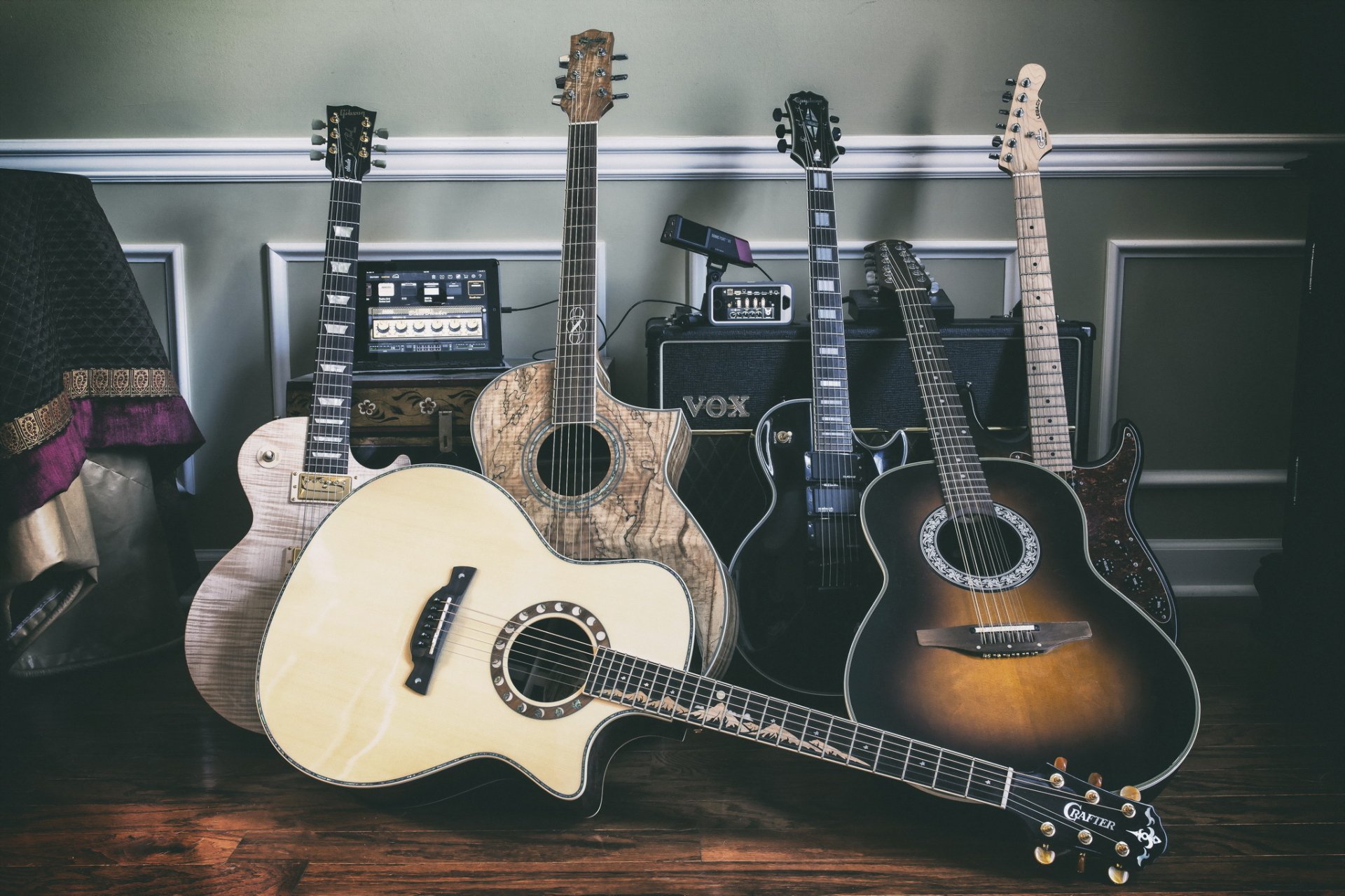 Gitary stoją na tle kombajnów