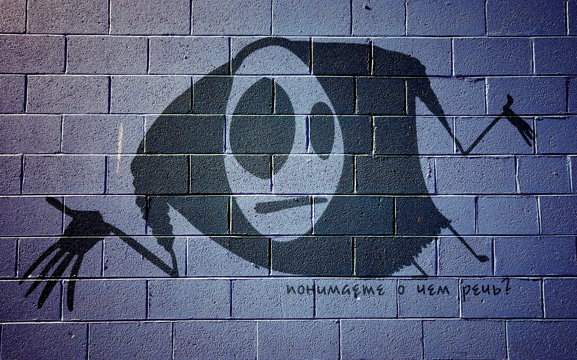 Ciężarówka z okrągłymi reflektorami stoi przy ścianie z graffiti