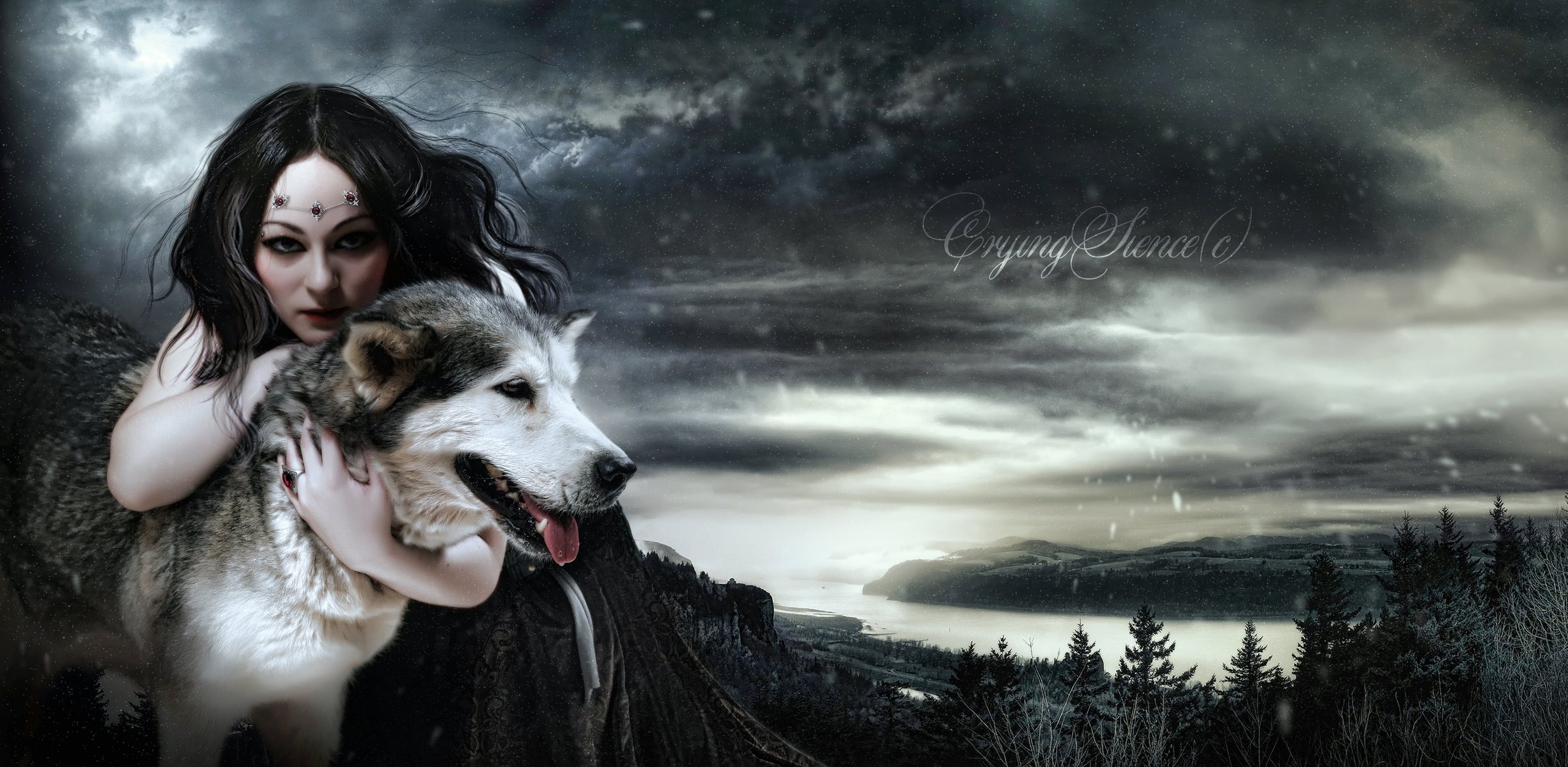 Dziewczyna z wilkiem na tle jeziora