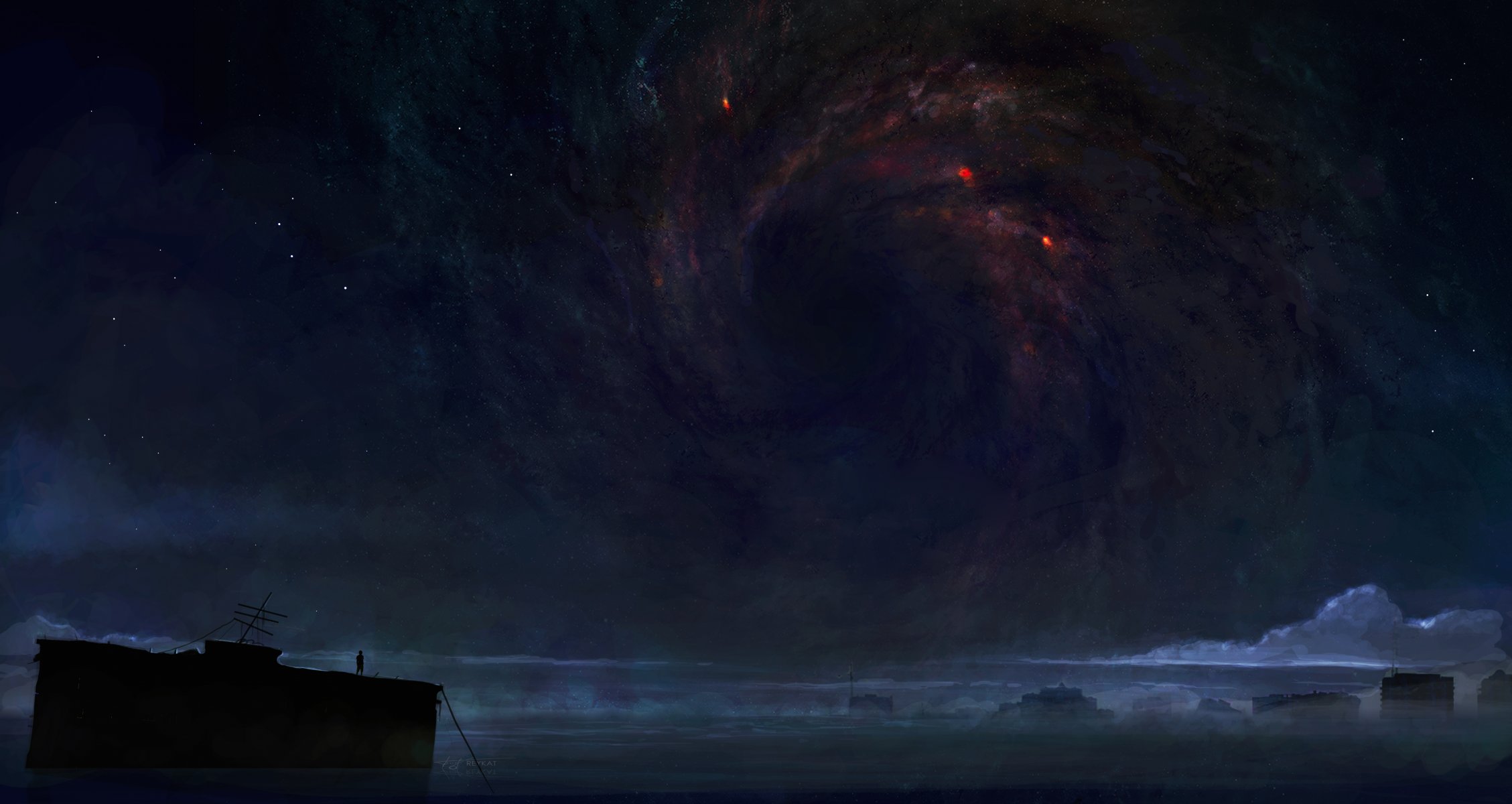 Art z salay. dziewczyna anime na tle chmur i gwiazdArt z salay. Dziewczyna anime na tle chmur i gwiazd