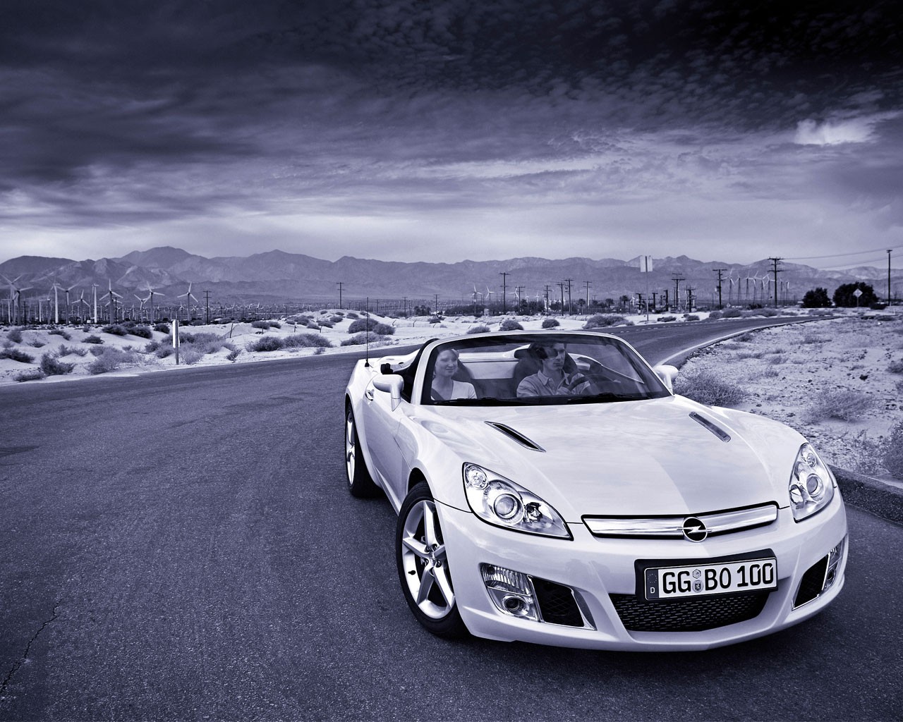 Kabriolet Opla jedzie wzdłuż wiatraków
