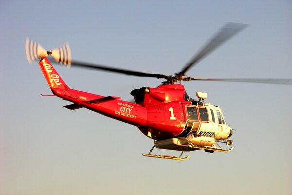 Czerwony helikopter ratunkowy nad górskim jezioremCzerwony helikopter ratunkowy nad górskim jeziorem