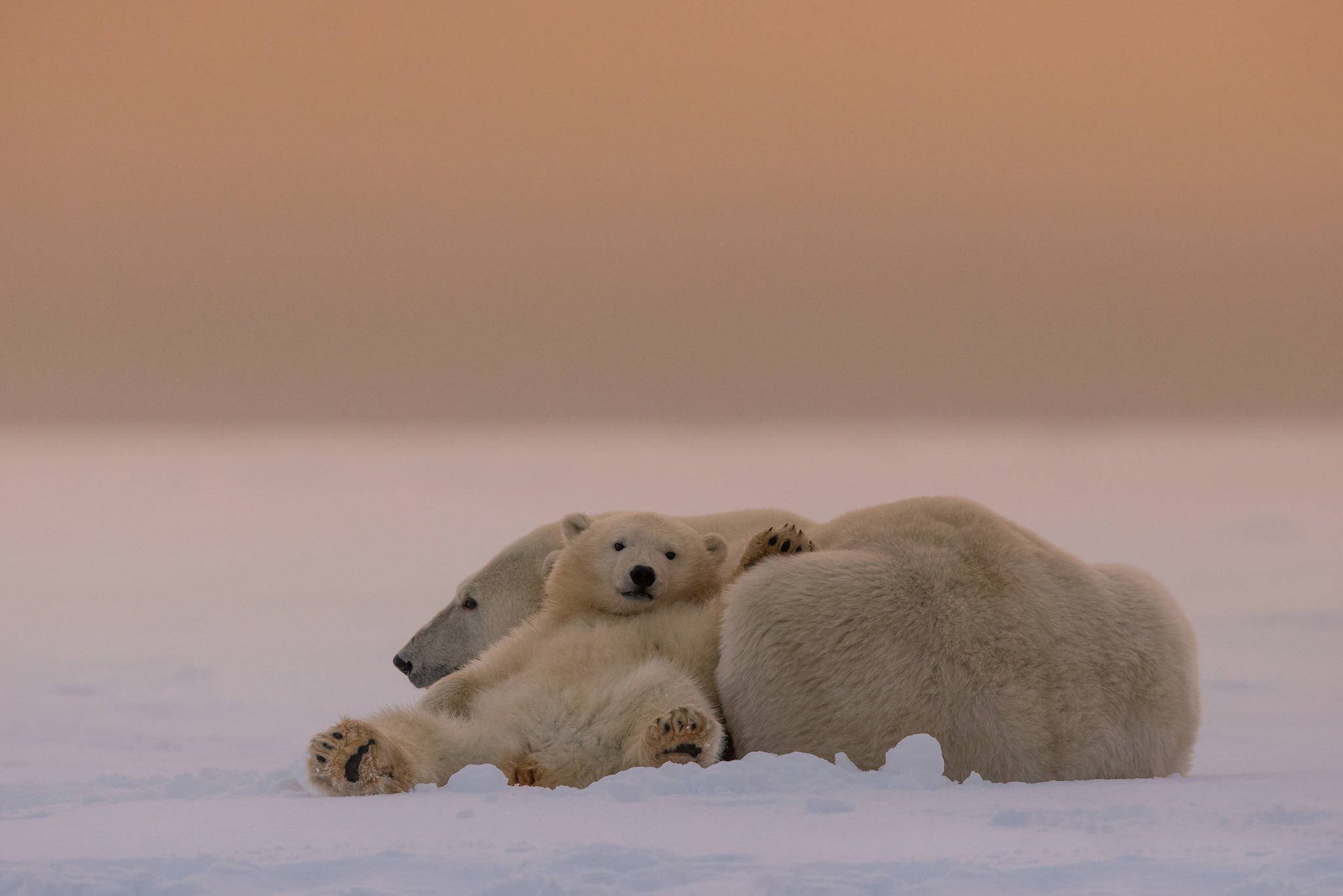 Miś i mama niedźwiedzia polarnego odpoczywają na śniegu