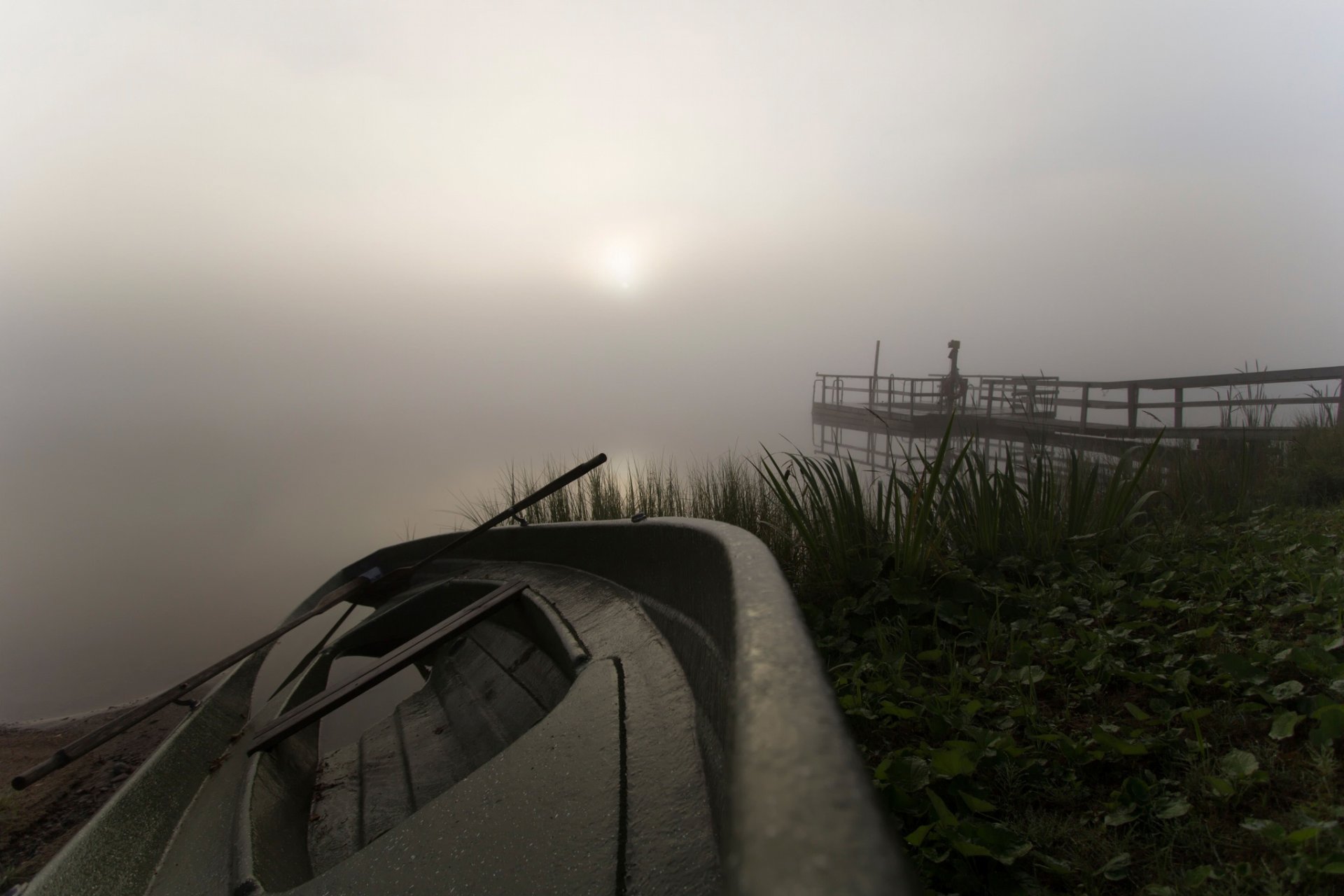 Poranek z mgłą i łodzią na jeziorze