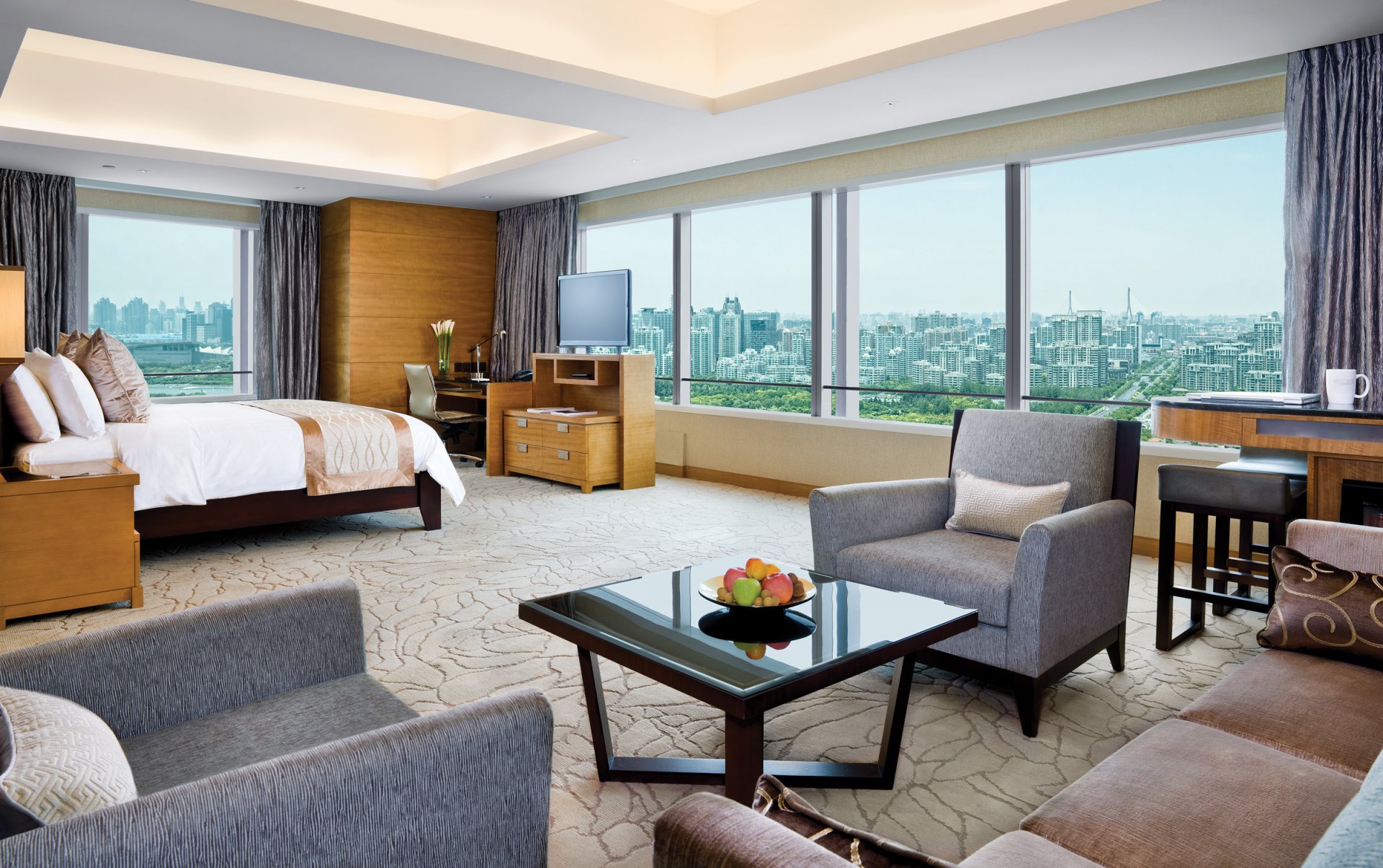 Wnętrze salonu w mieszkaniu z panoramicznymi oknami