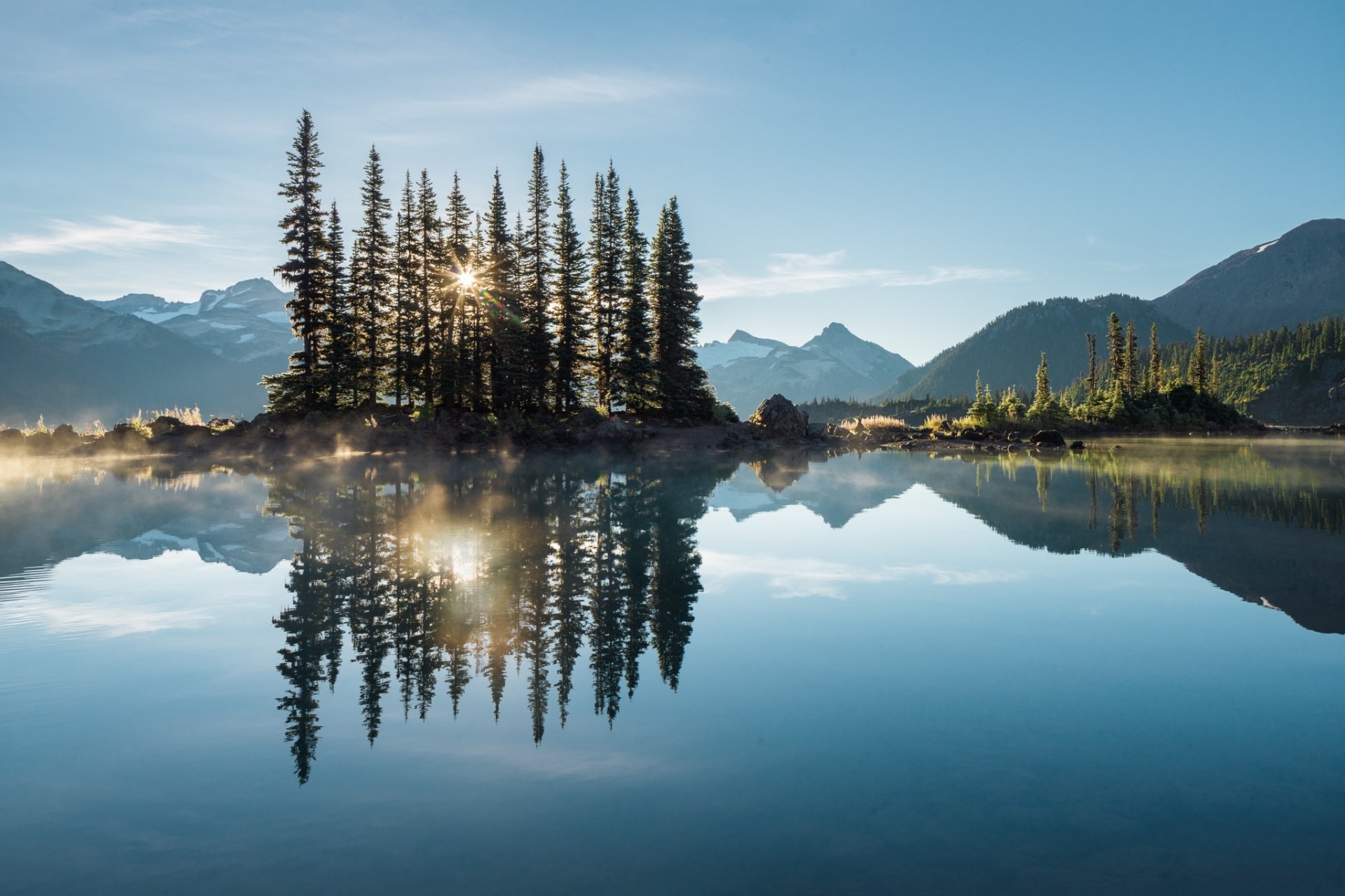 Gładkie jezioro pod błękitnym niebem wśród szkarłatnych pasm drzew