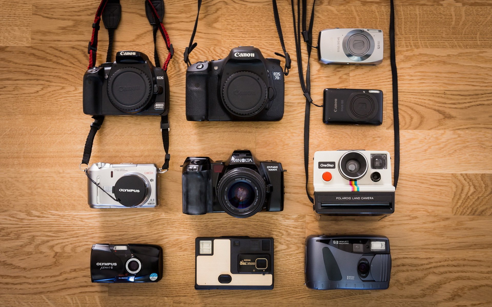 Dwa aparaty "Canon" i "Nikon" z dialogiem między nimi