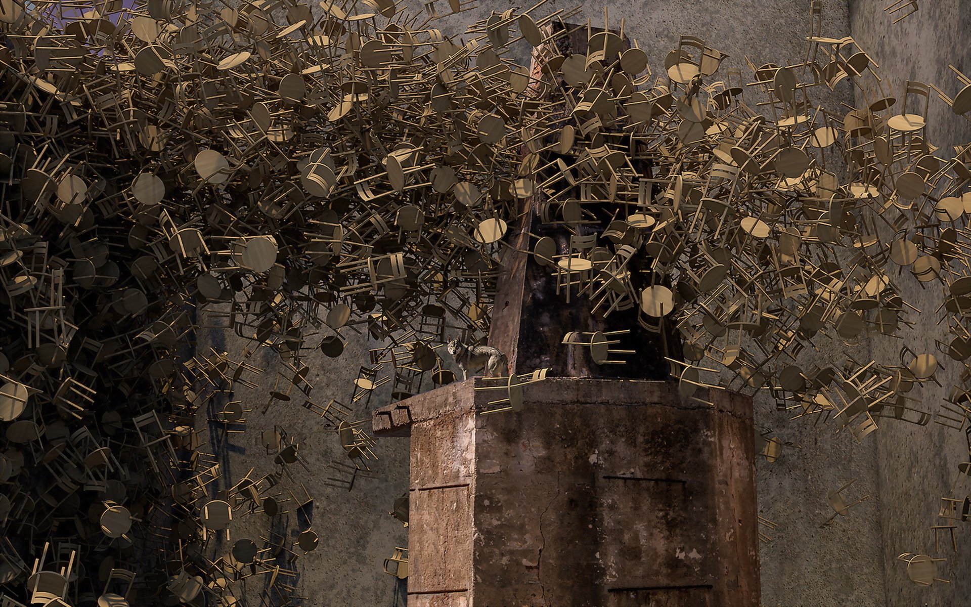 Obraz w wersji abstrakcyjnej z wizerunkiem krzeseł. Niezwykły obraz z wieloma krzesłami