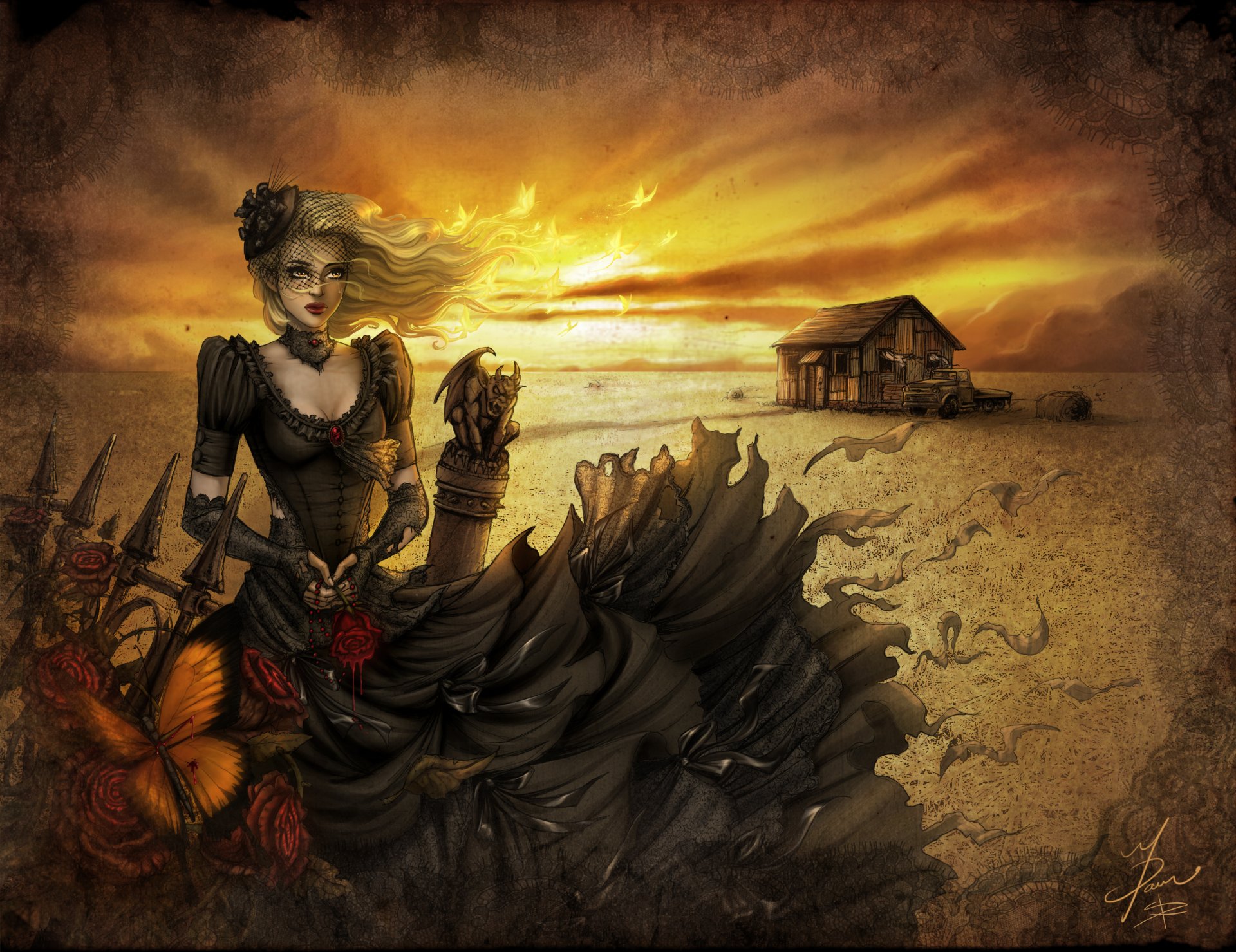 Gotycka dziewczyna w czarnej sukience i kapeluszu na tle domku i zachodu słońca
