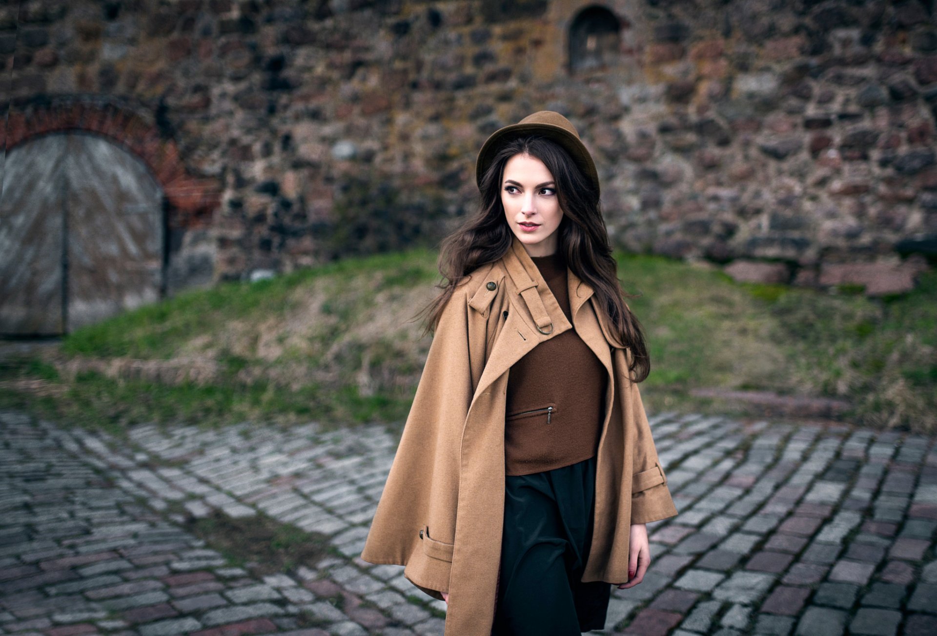 Brązowooka Karina w białej sukni na skalistym brzegu