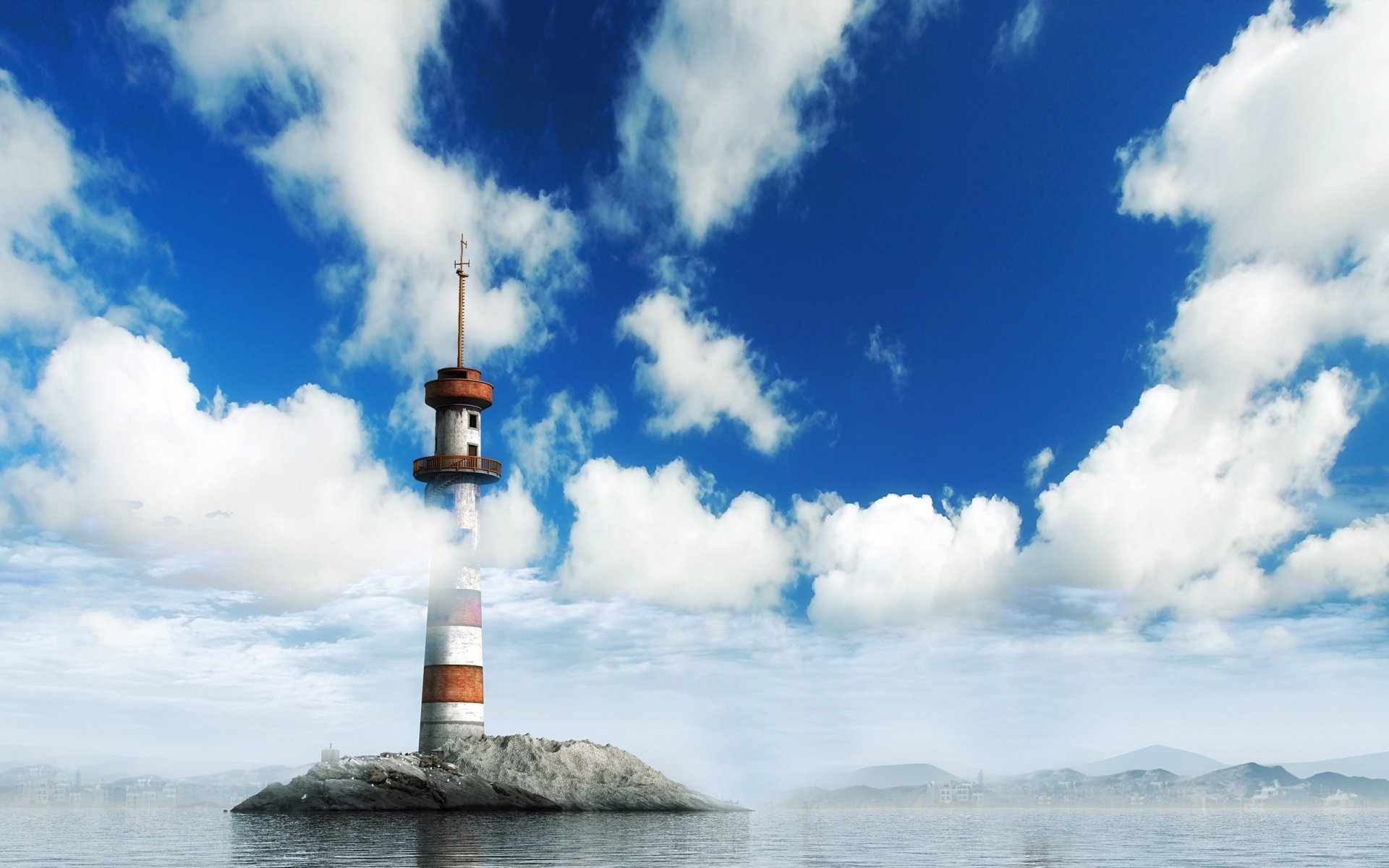 Latarnia morska na wyspie w chmurach
