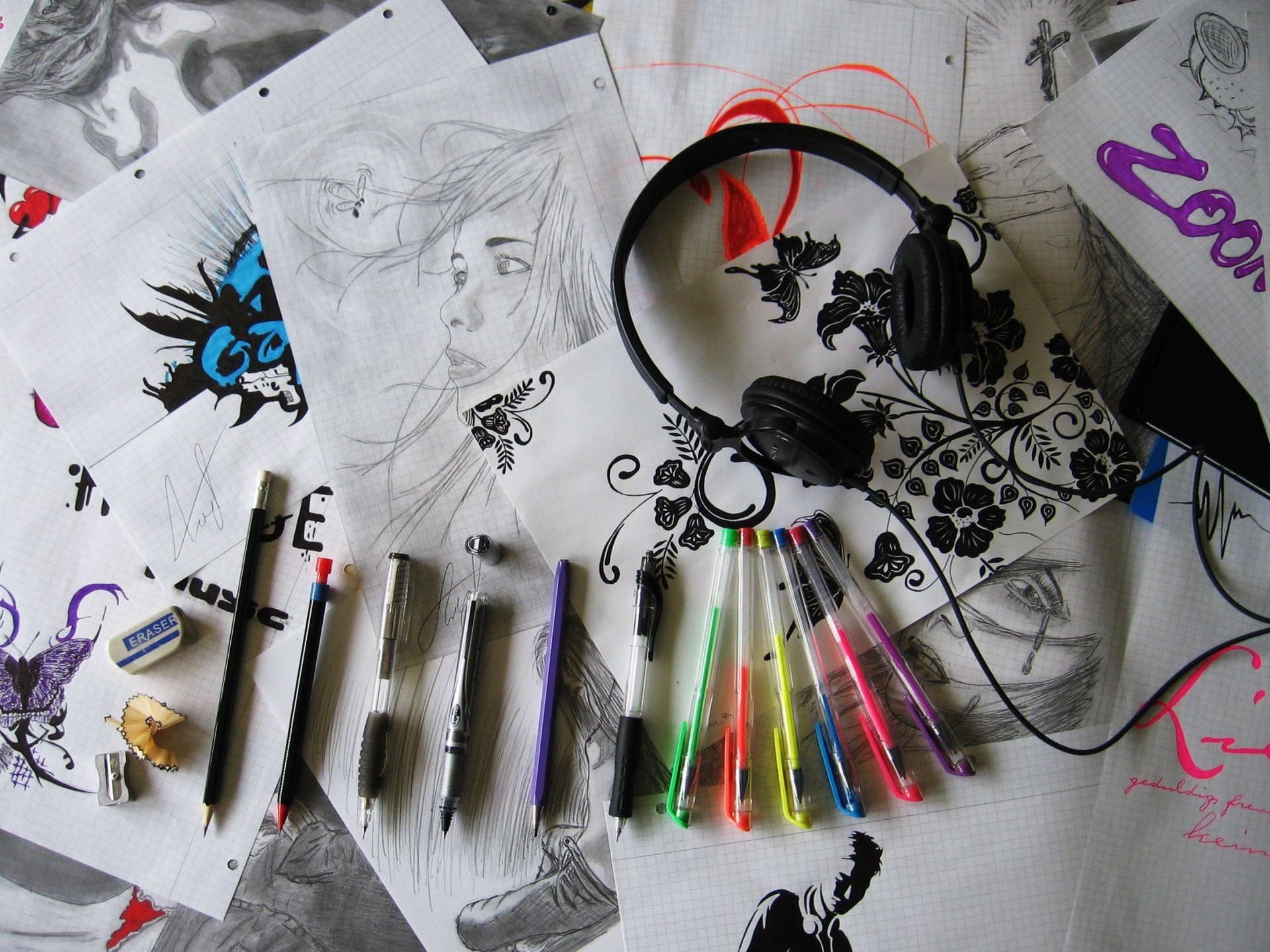 Kolorowe długopisy ze słuchawkami na rysunkach