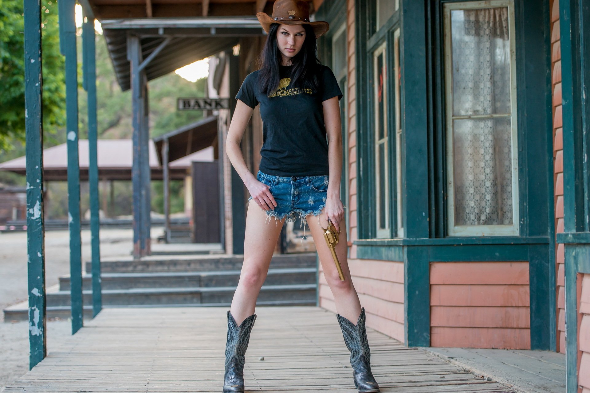 Dziewczyna w kapeluszu z ogromnym karabinem maszynowym