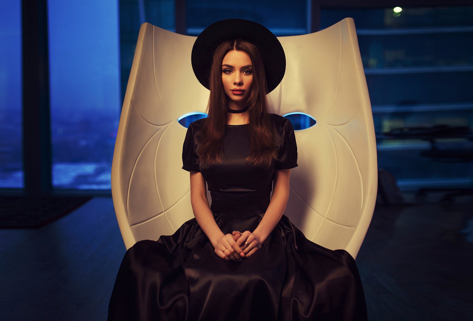 Dziewczyna w czarnej sukience i Kapeluszu Siedzi na krześle