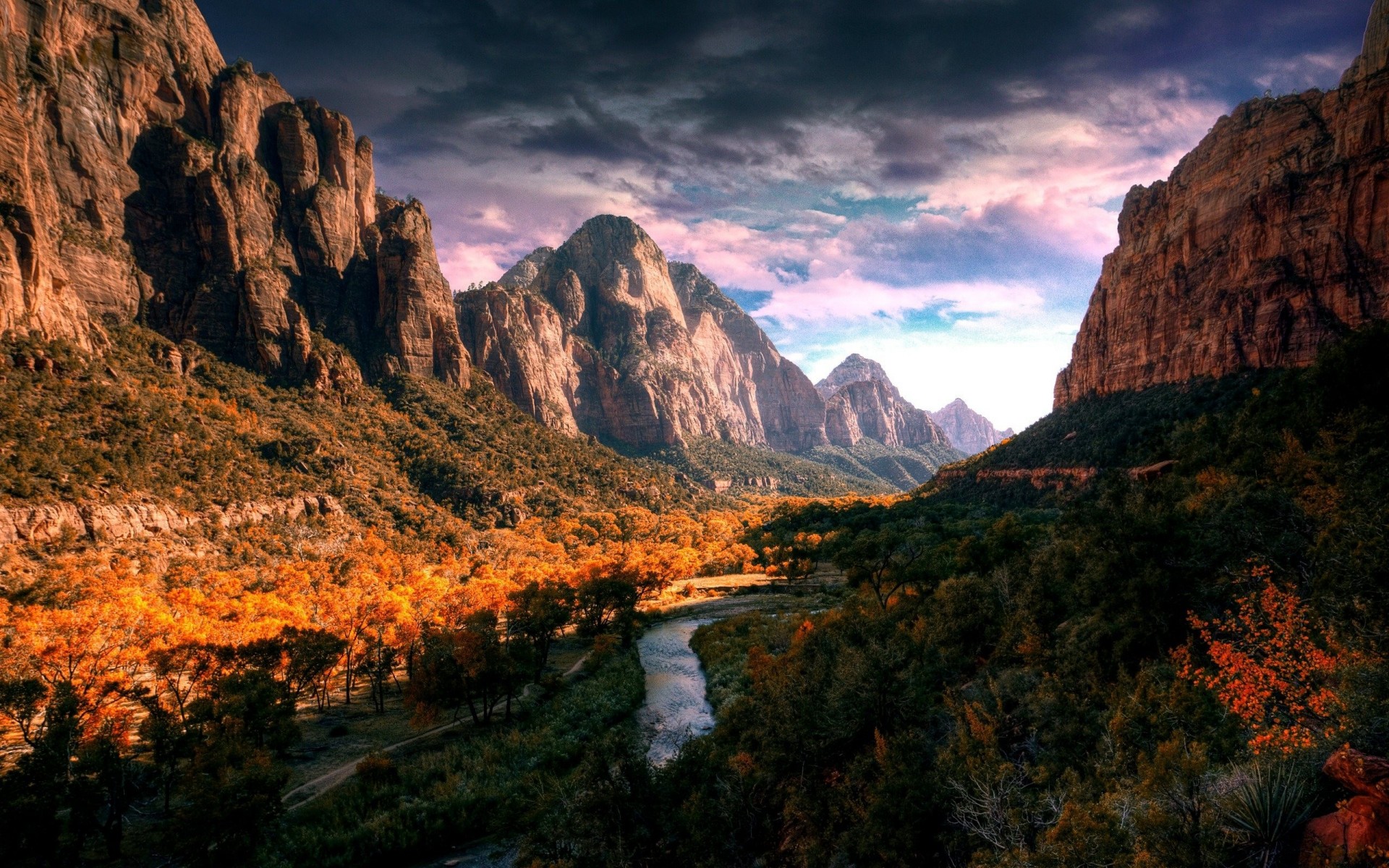 Krajobraz zalesionych szczytów górskich i rzeki otoczony dużymi kamieniami