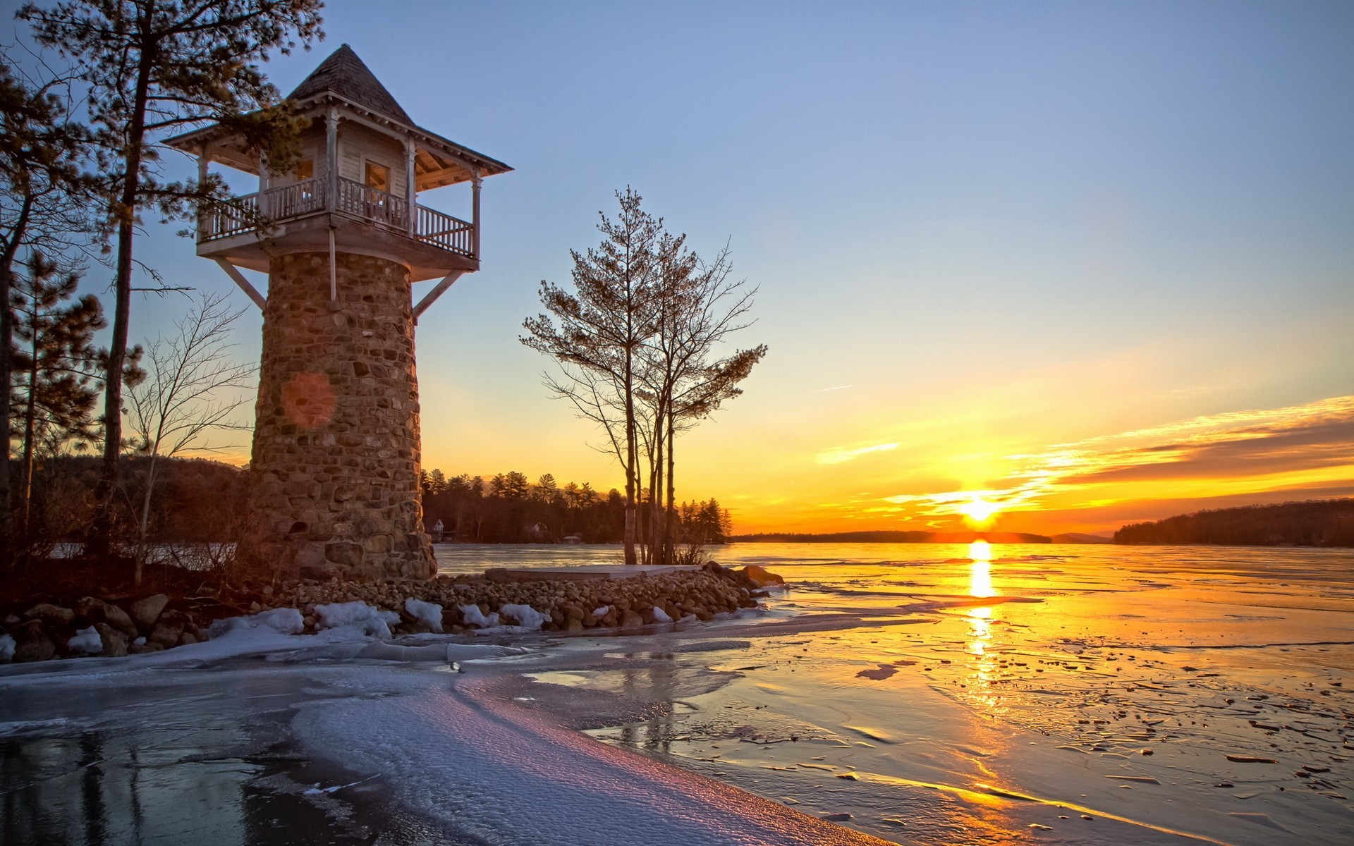 Krajobraz z latarnią morską na tle zachodu Słońca