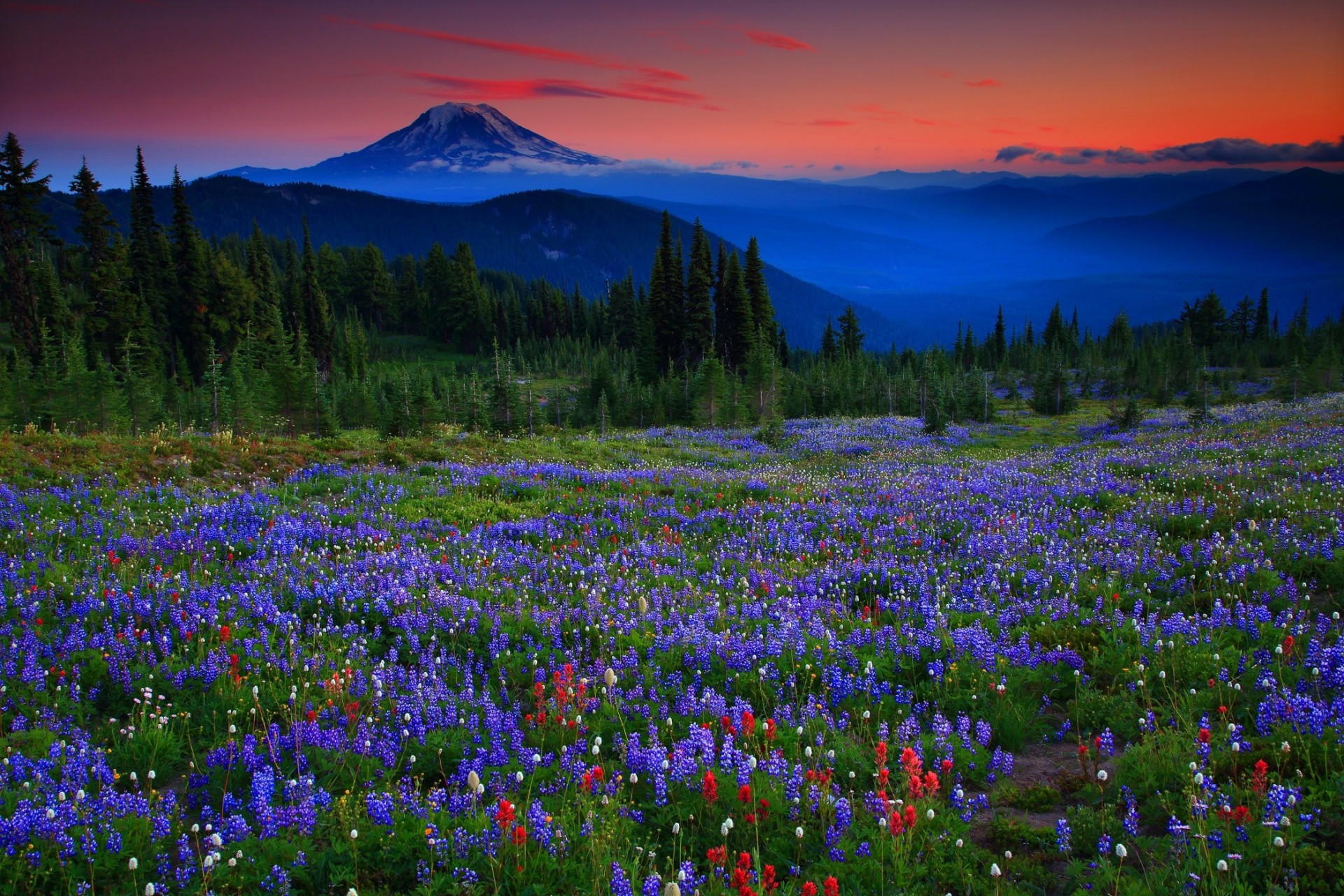 Zachód słońca na trawniku w górach. Krajobraz