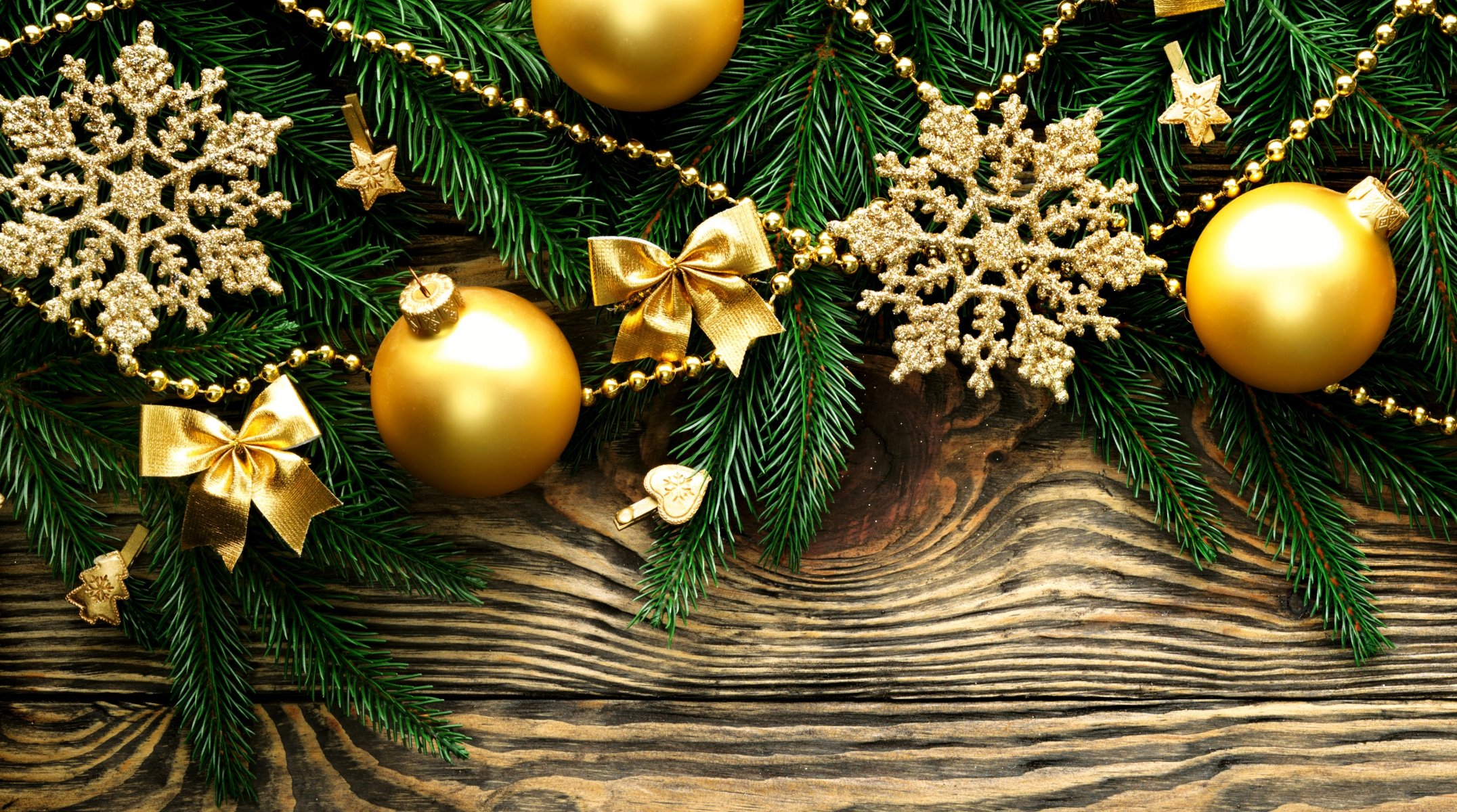Złote płatki śniegu, kulki i kokardki na gałęzi świerkowej