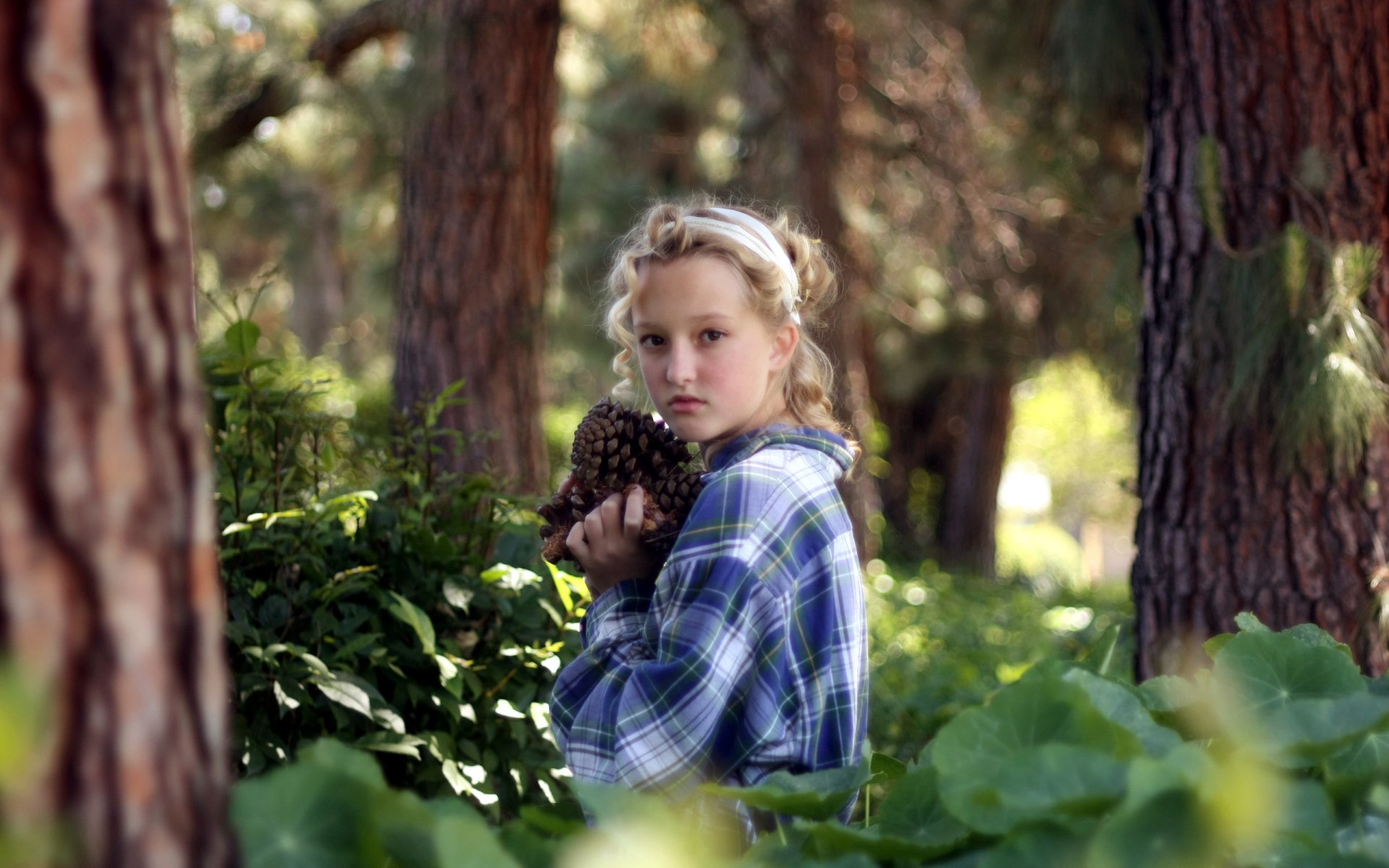 Dziewczyna w kraciastej koszuli w drzewach, rozmycieDziewczyna w kraciastej koszuli w drzewach, rozmycie