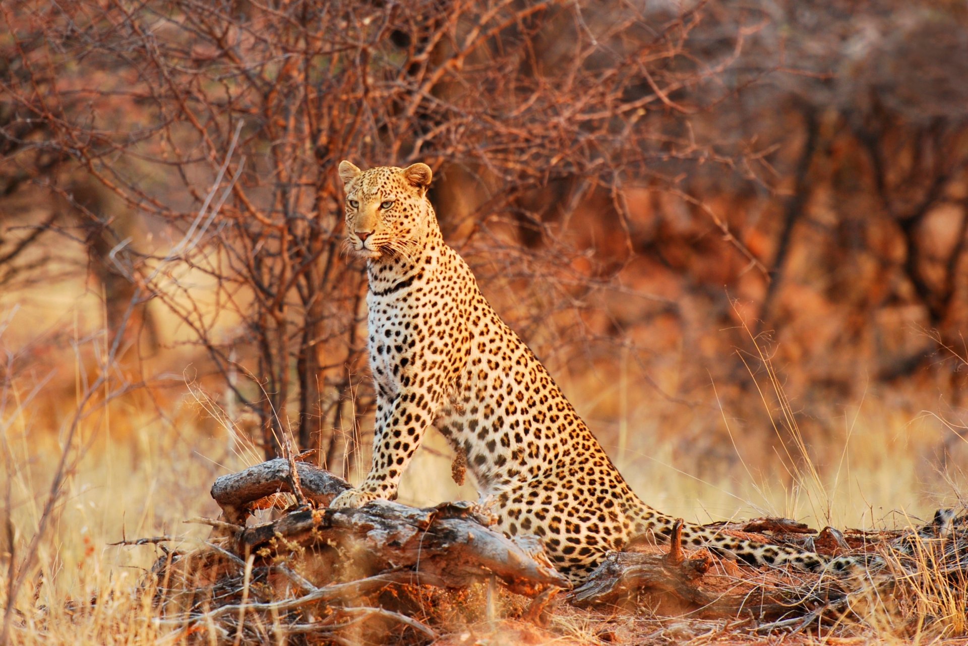 Majestatyczny Lampart siedzi na powalonym drzewie szukając zdobyczy