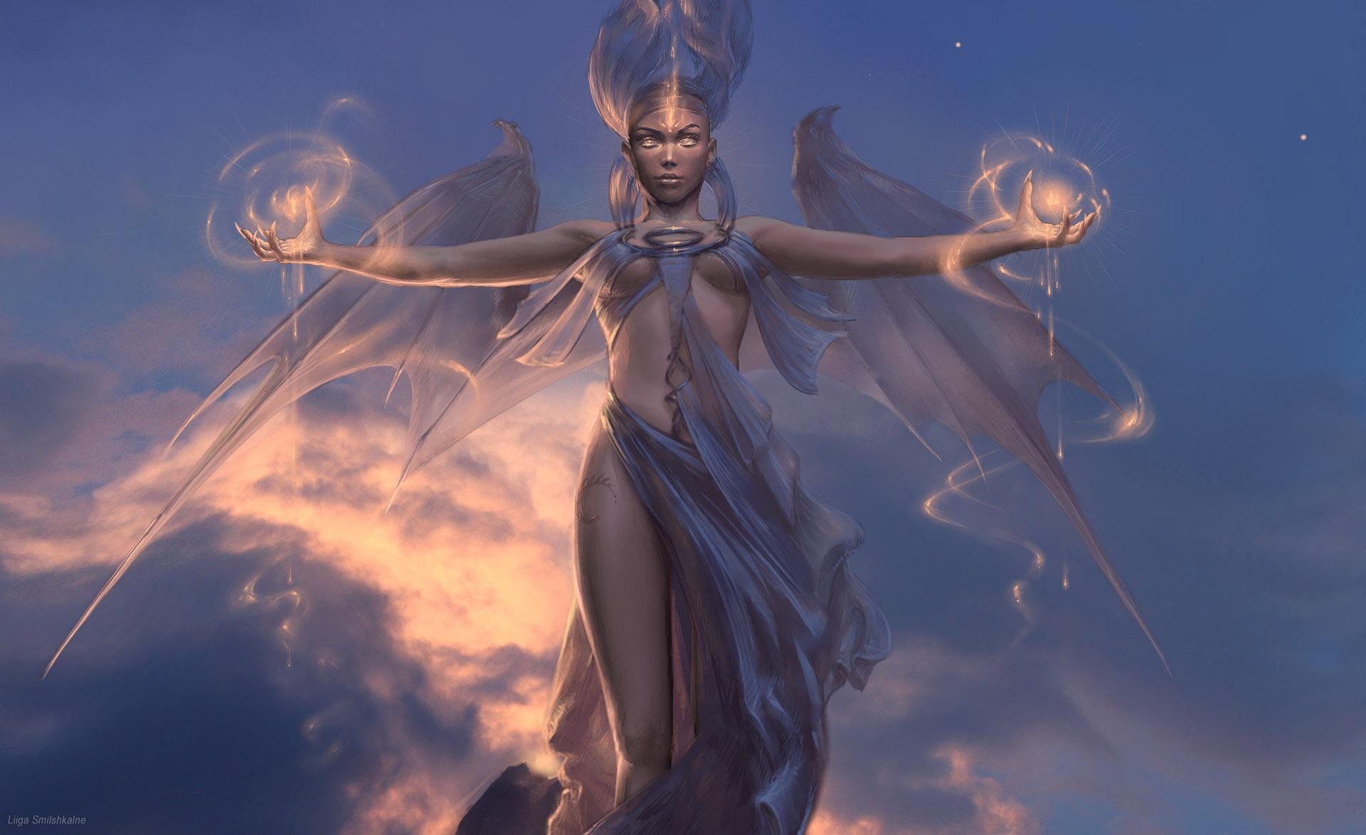 Magiczna dziewczyna ze skrzydłami i świecącymi kulkami na dłoniach