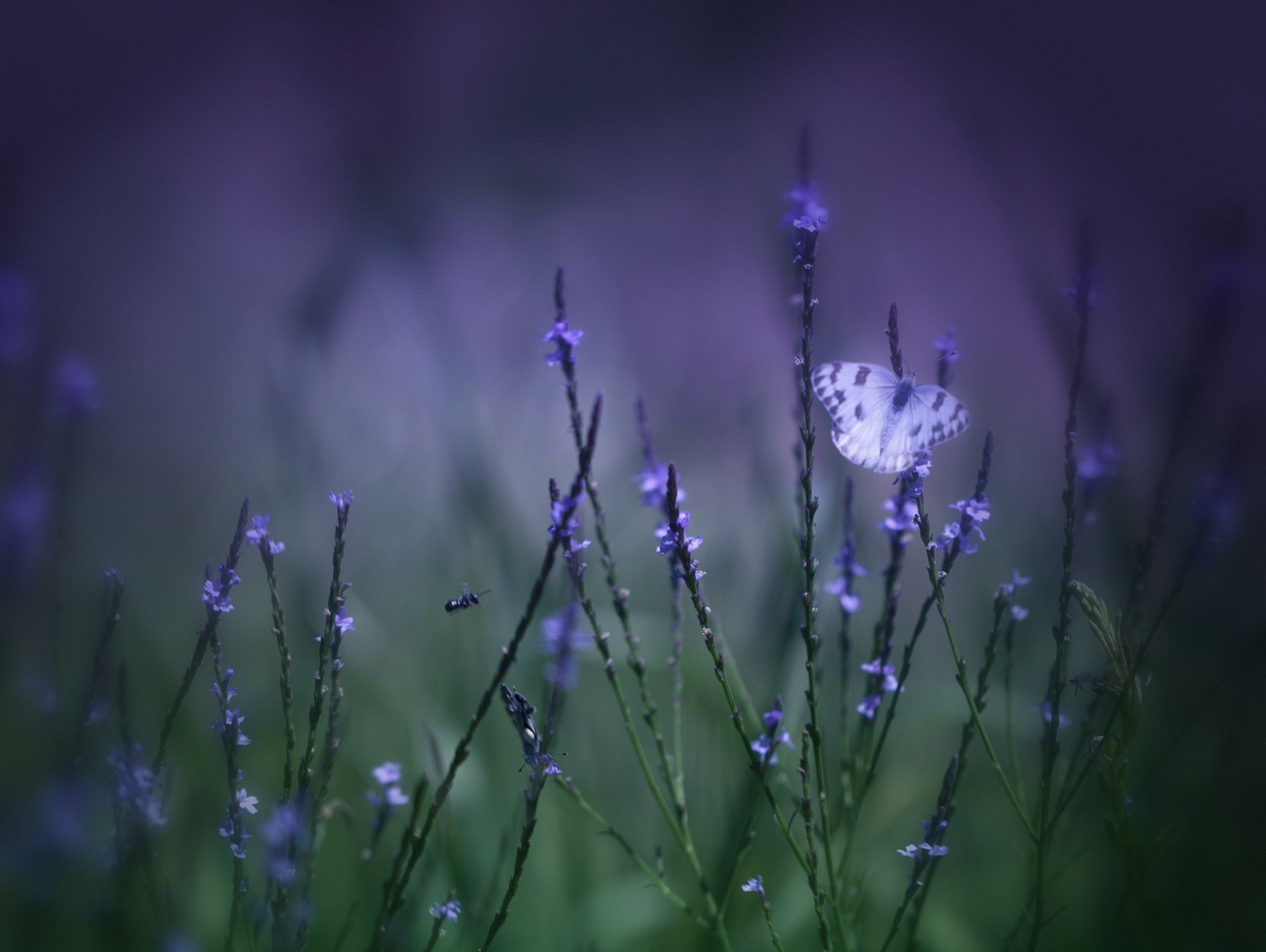 Motyl na liliowych kwiatach na rozmytym tle