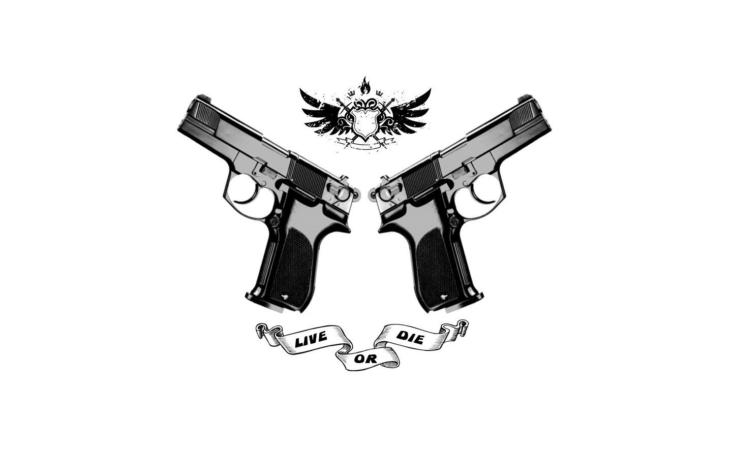 Dwa pistolety z napisem "żyć albo umrzeć"