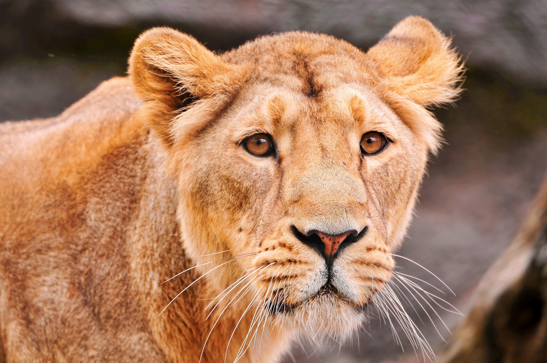 Dziewczyna w koszulce ze wzorem, obok leży lwica