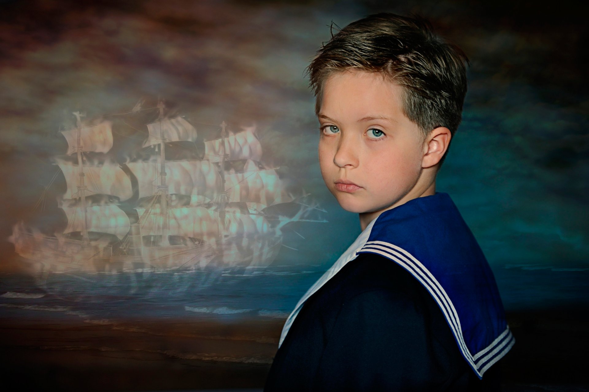 Młody żeglarz na tle obrazu "Szkarłatne żagle"