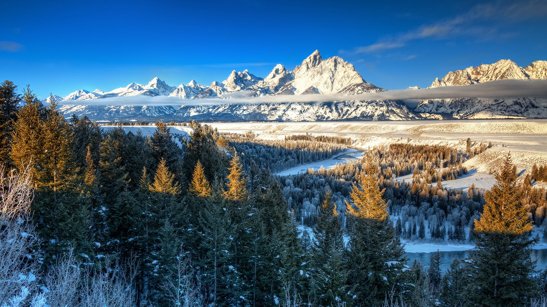 Ośnieżone góryi piękny las na tle szorstkiego nieba