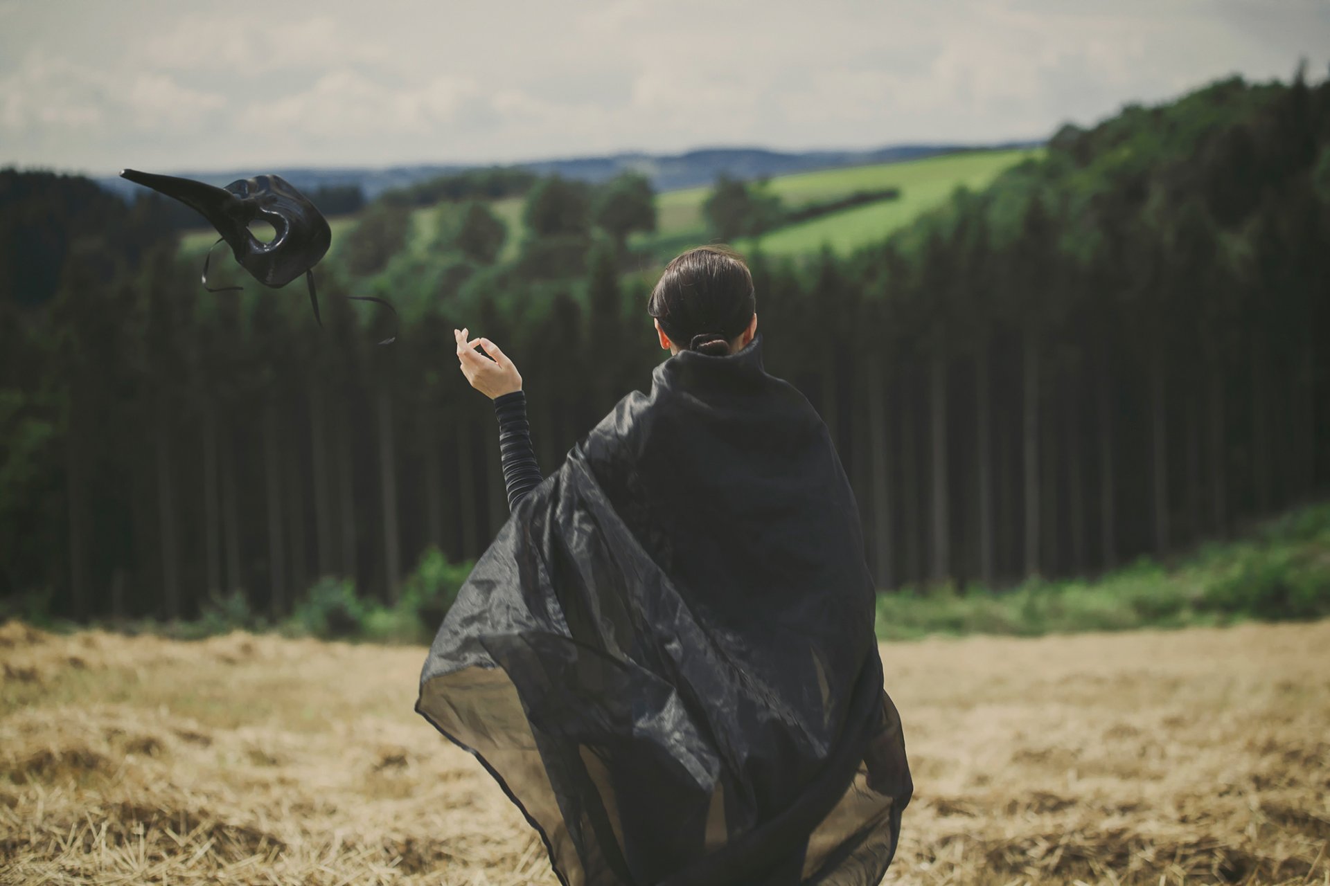 Dziewczyna w czarnej szacie zrzuca maskę