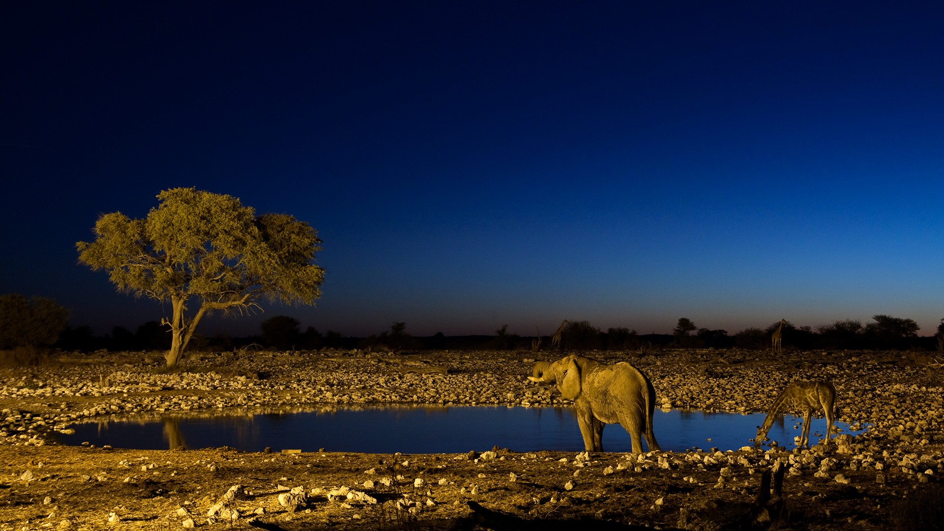 Słoń i żyrafa przy wodopoju nocą w Afryce