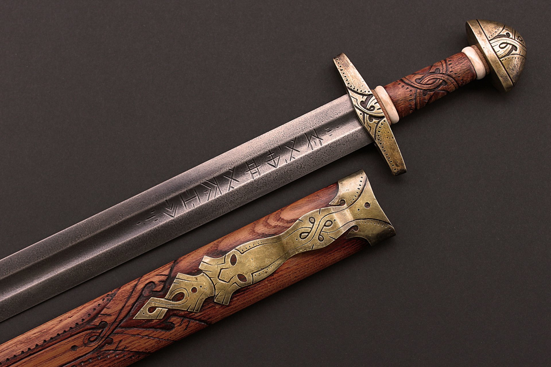 Miecz z pochwą spoczywa na drewnianej powierzchni
