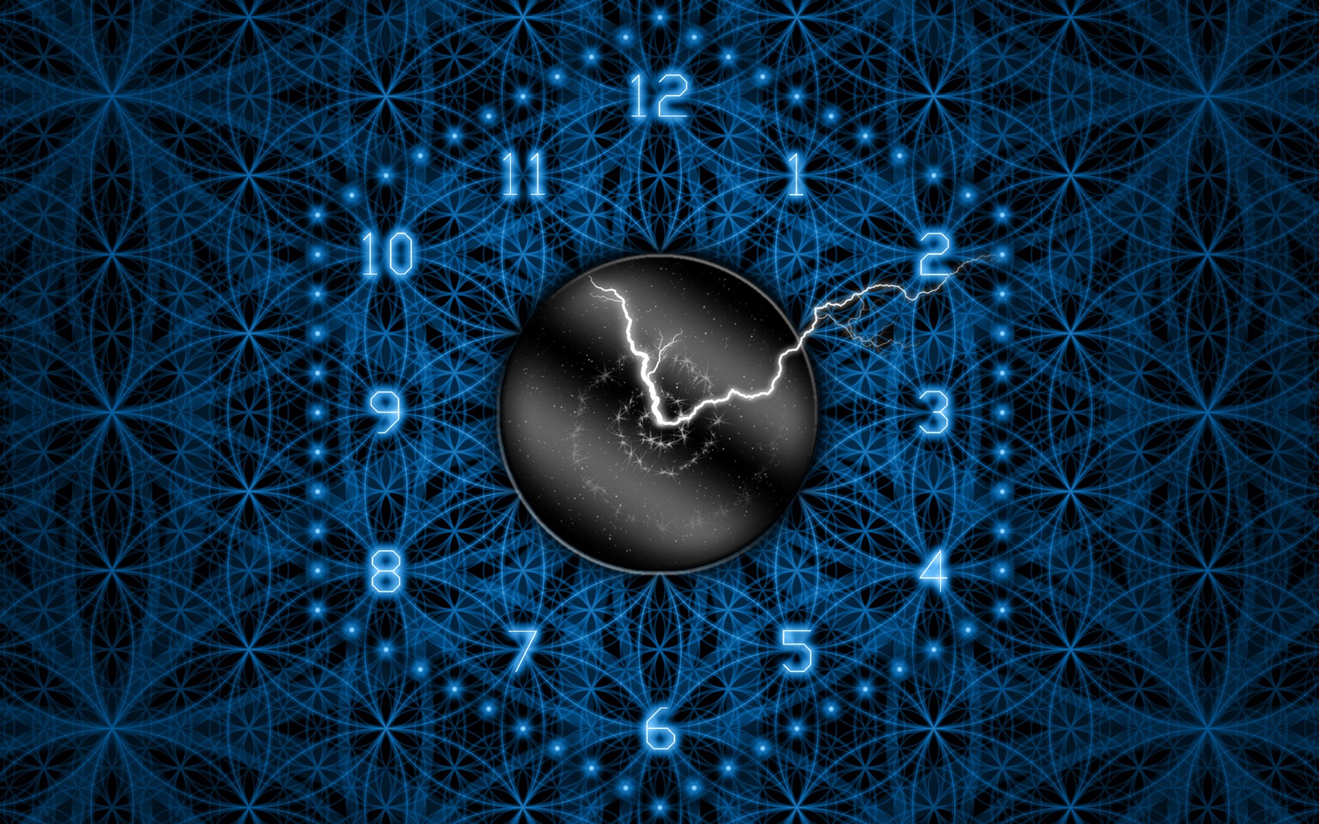 Czarna Tarcza ze wskazówkami błyskawicy na tle niebieskiego wzoru