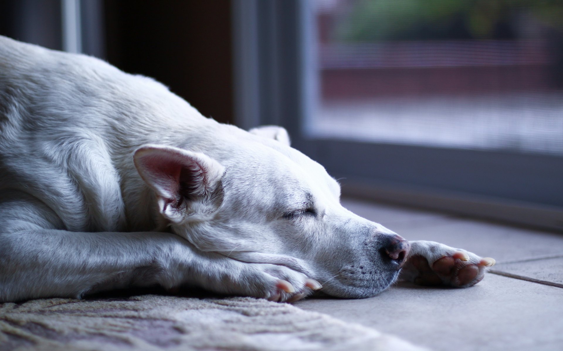 Biały pies siedzi na polu wśród mniszka lekarskiego