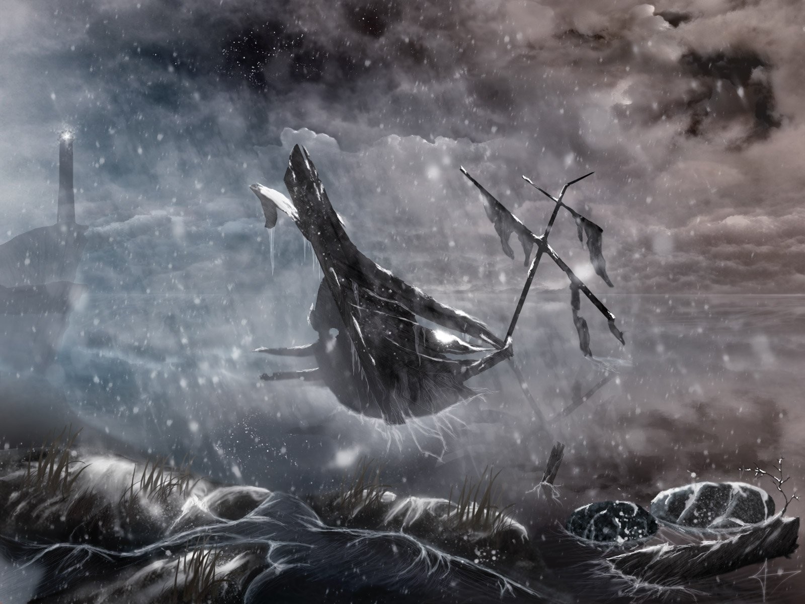 Fantasy art z potworem w jeziorze przy latarni morskiejFantasy art z potworem w jeziorze przy latarni morskiej