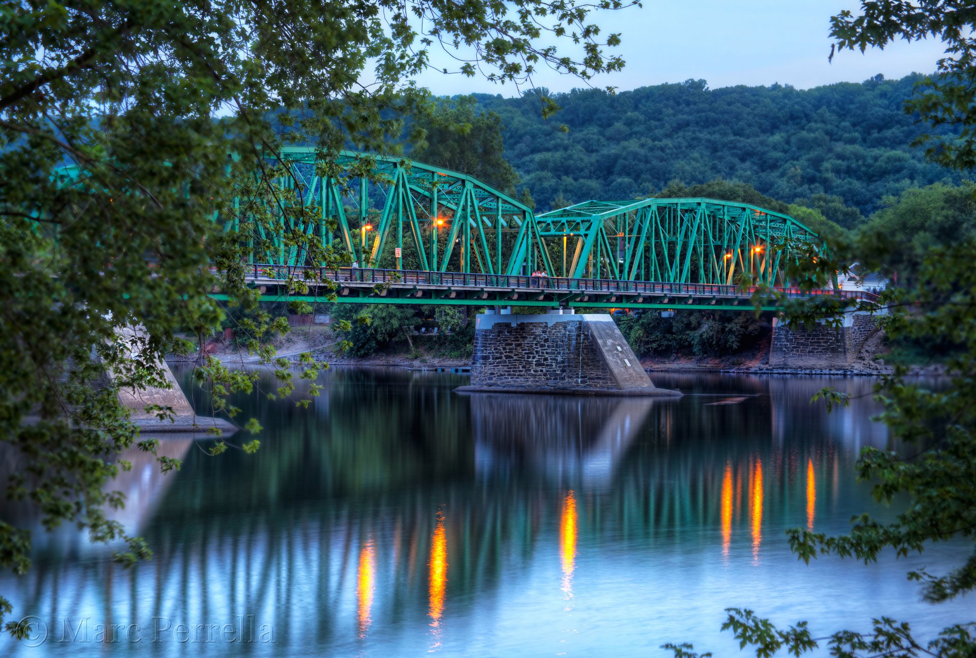 Zielony Most w światłach na rzece