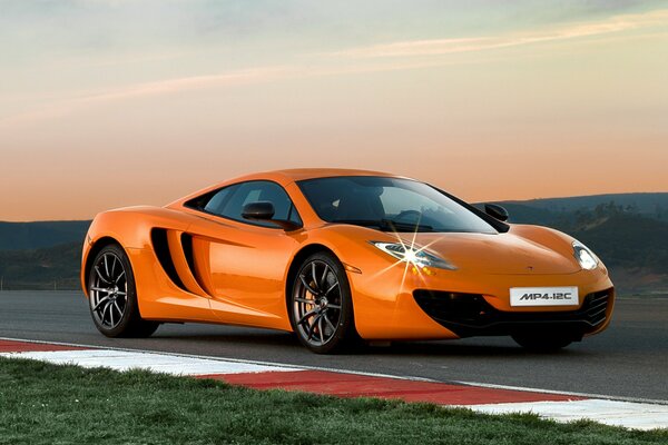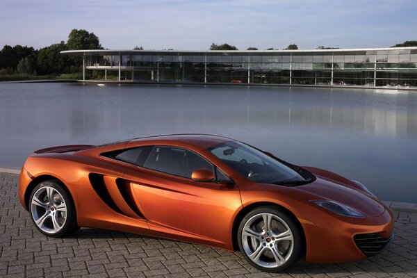 Pomarańczowy samochód sportowy mclaren mp4-12cna tle basenuPomarańczowy samochód sportowy McLaren mp4-12cna tle basenu