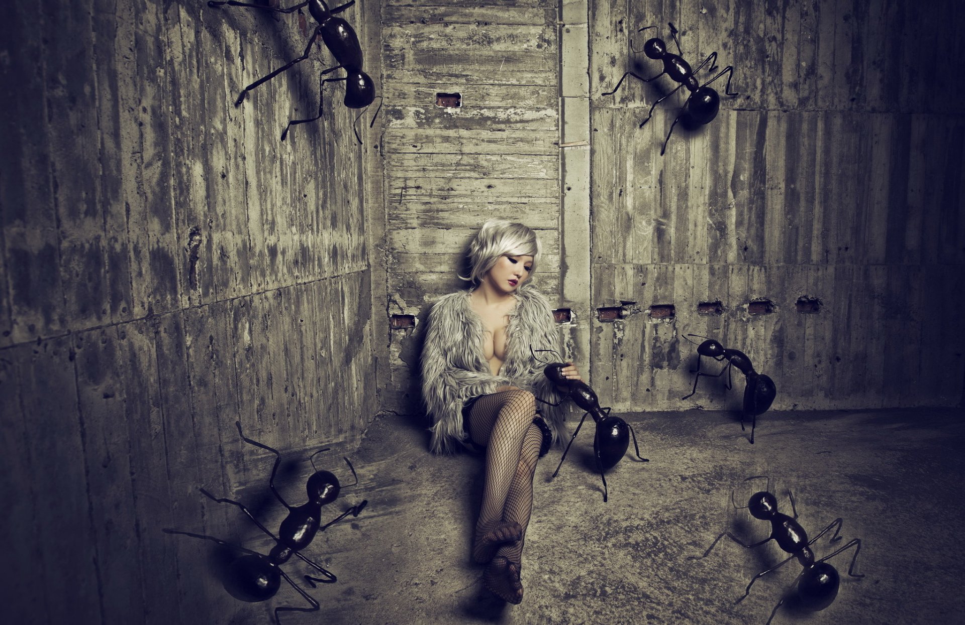 Dziewczyna siedząca na piasku w stodole z ogromnymi mrówkami