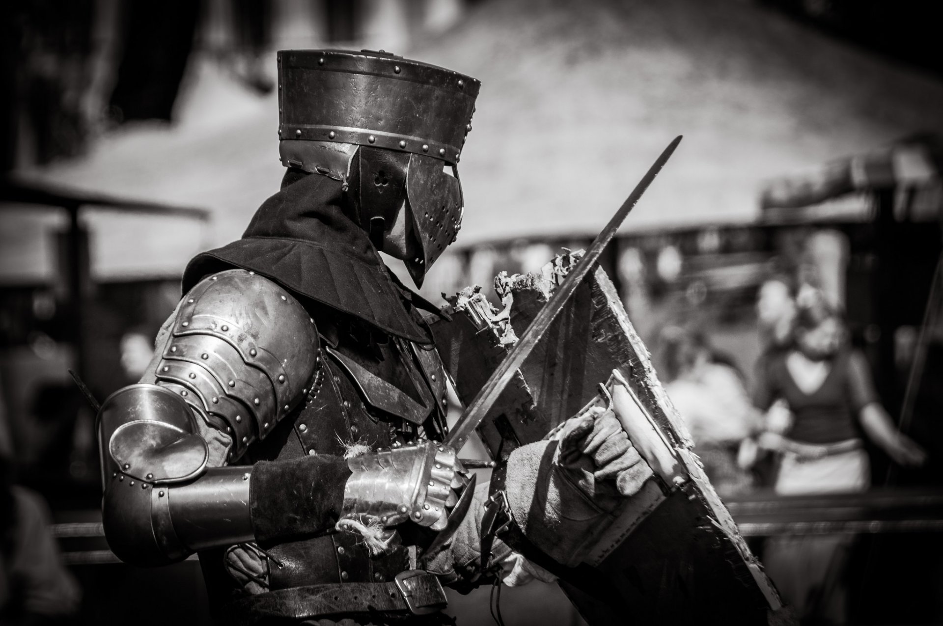 Rycerz w zbroi z mieczem siedzi na ziemi
