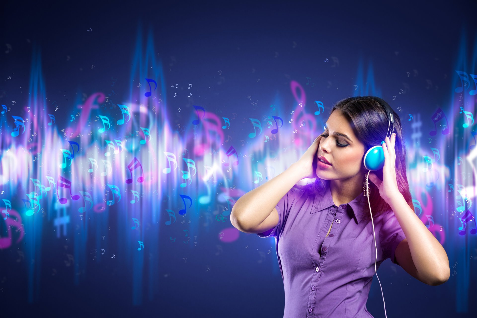 Dziewczyna słucha muzyki w słuchawkach na kolorowym tle