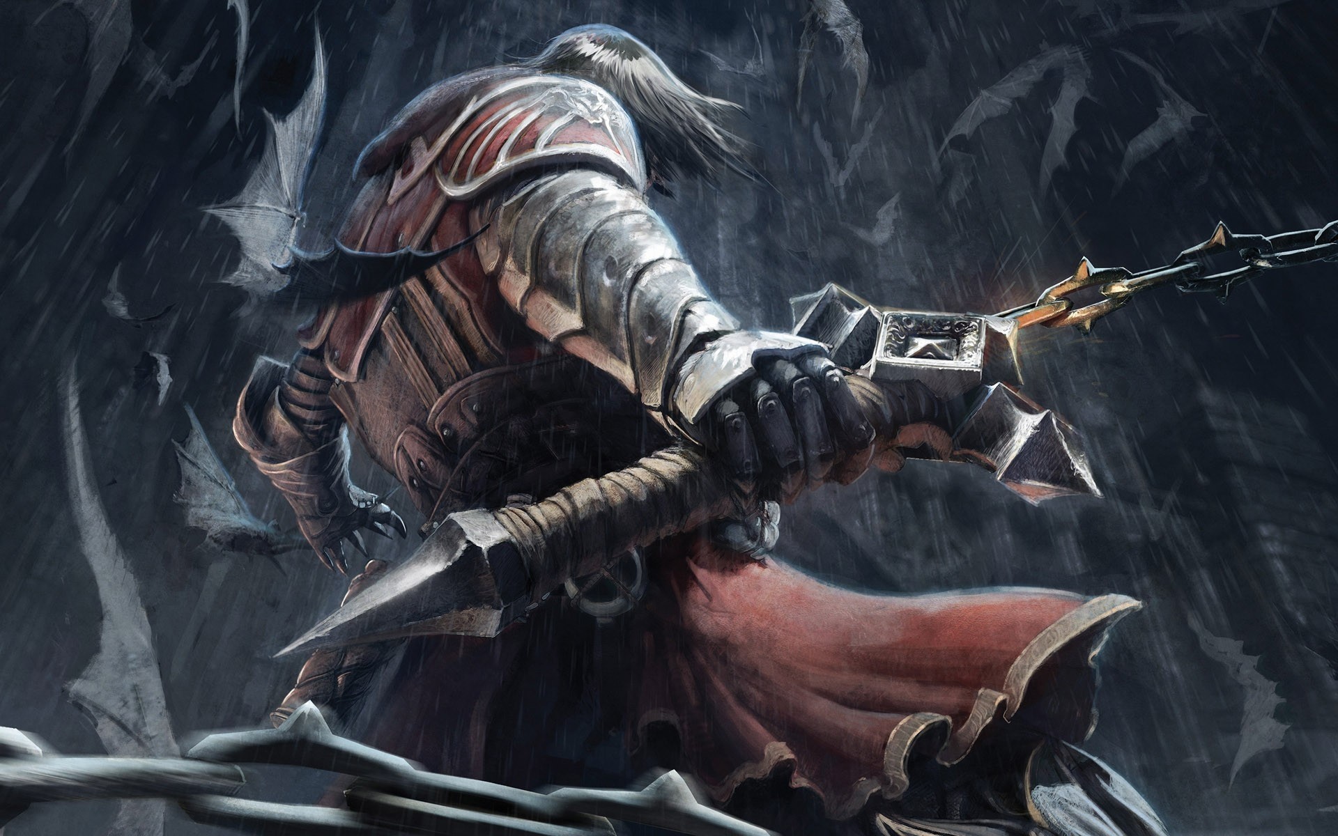 Wojownik z bronią przedziera się przez nietoperze