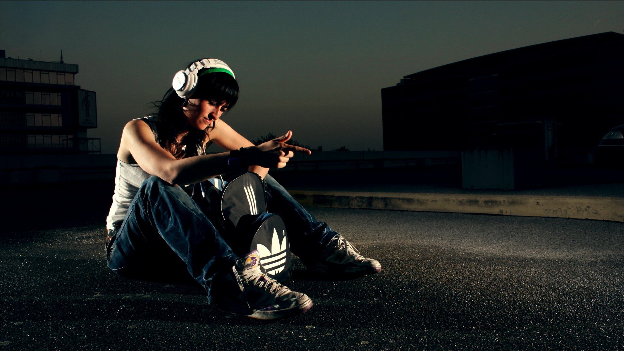 Dziewczyna w słuchawkach i z torbą siedzi na dachu