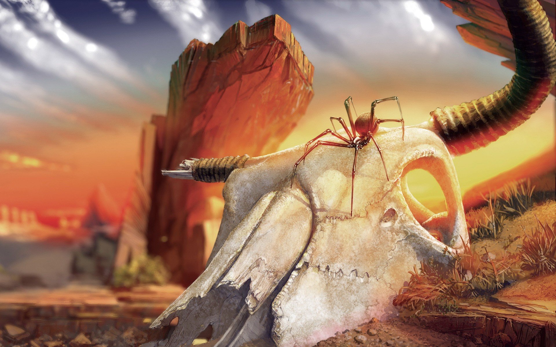 Pająk na czaszce bawoła w piasku