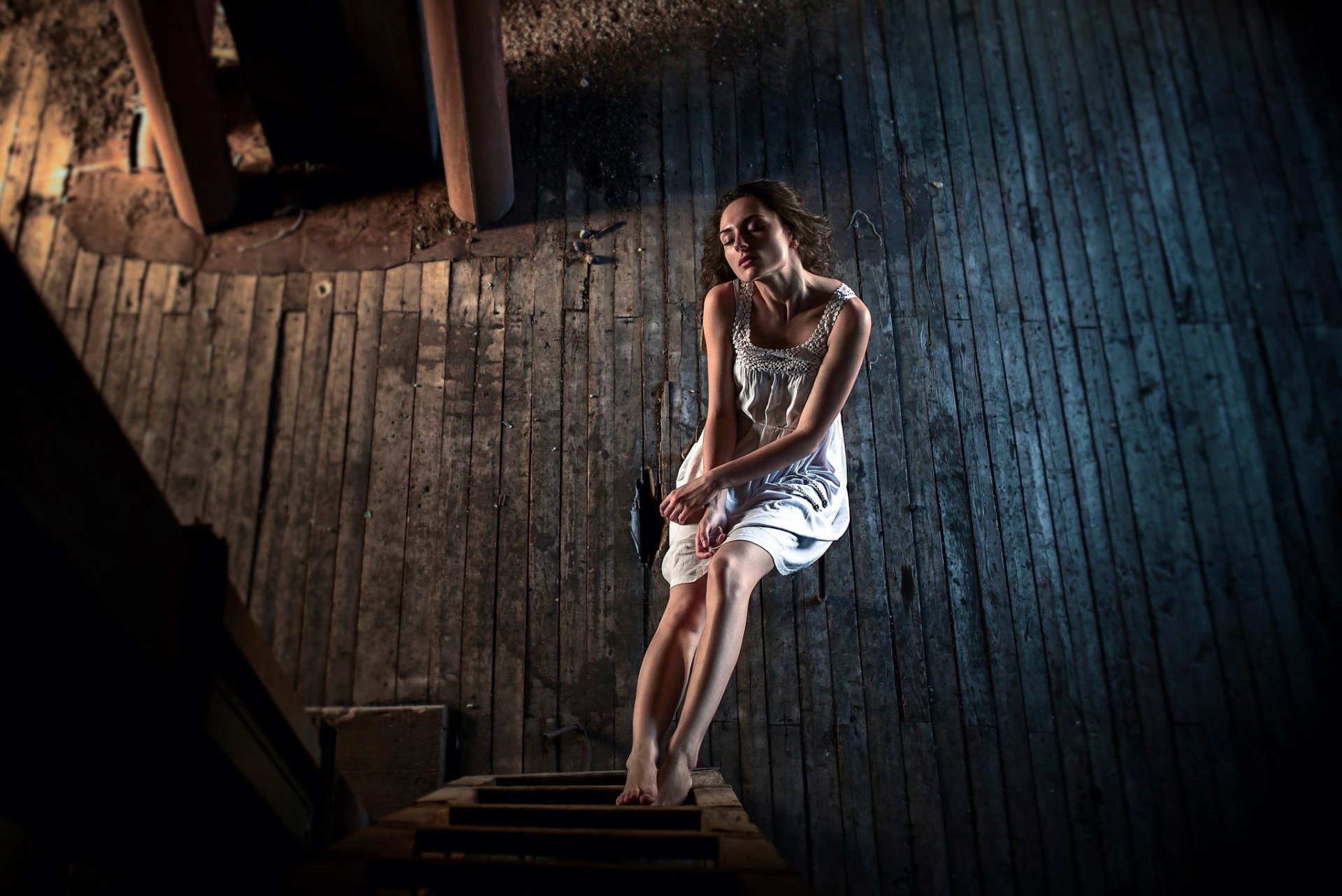 Dziewczyna z ptakiem na schodach w pobliżu kolumn