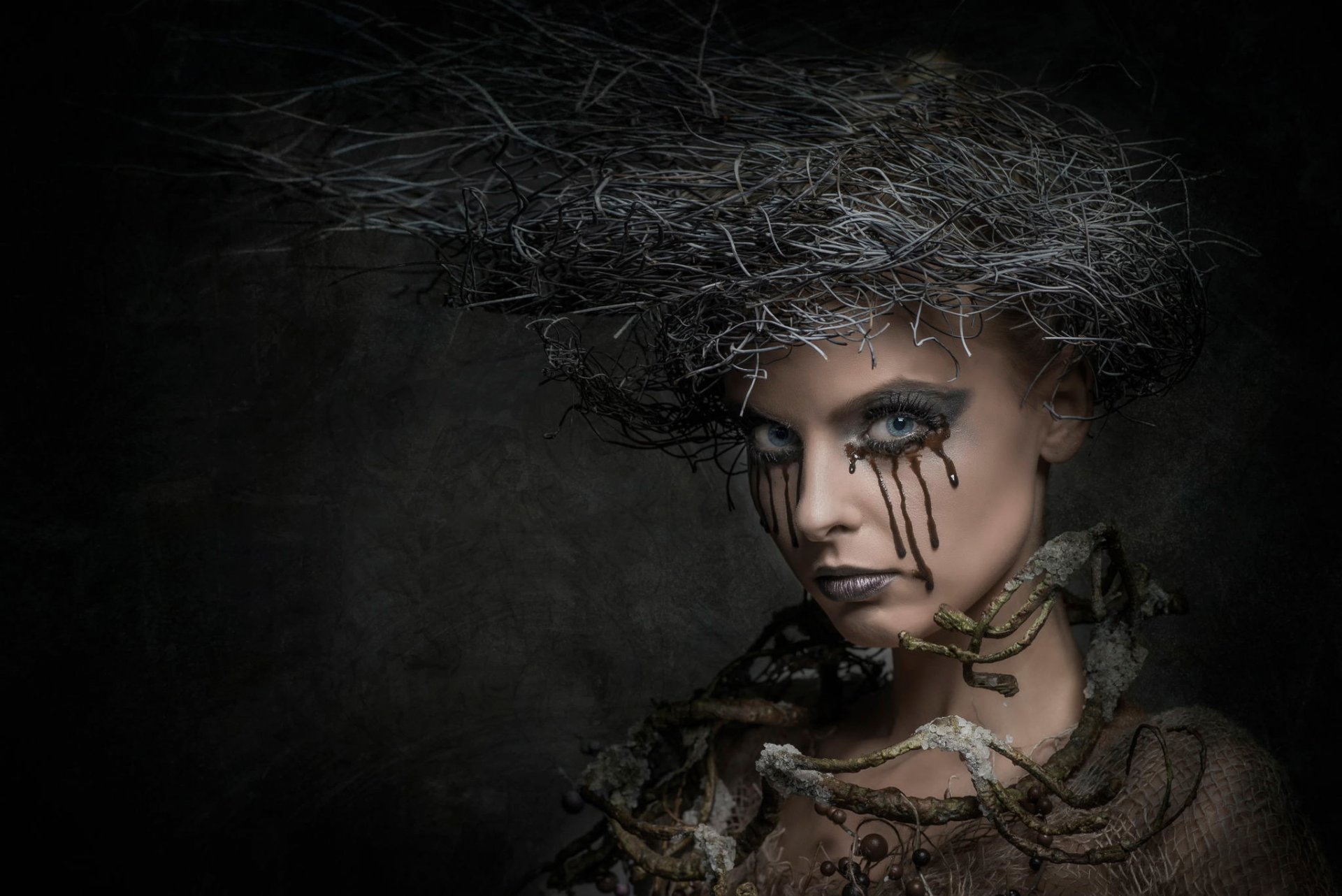 Dziewczyna o niebieskich oczach z gniazdem na głowieDziewczyna o niebieskich oczach z gniazdem na głowie
