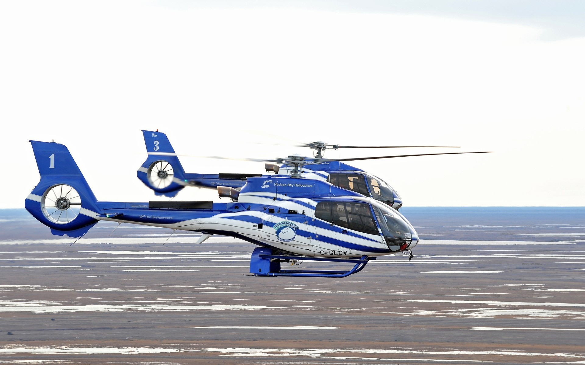 Niebieskie helikoptery lecą nad pustkowiem w Ameryce