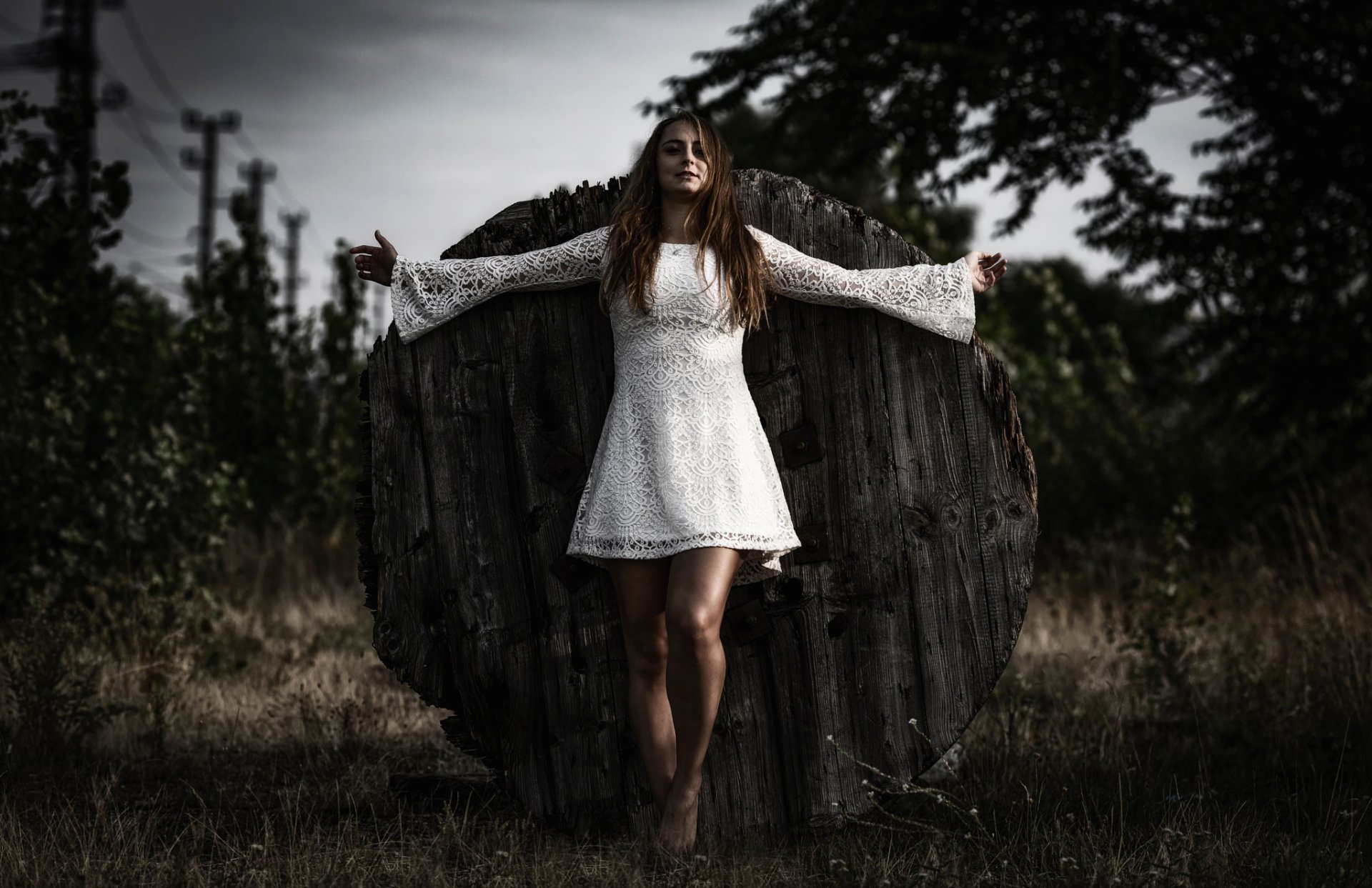 Piękna dziewczyna w białej sukience pozuje w lesiePiękna dziewczyna w białej sukience pozuje w lesie